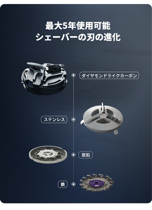 そこでX1はダイヤモンドライクカーボン(DLC)の刃を採用しました、唇や喉元などの柔らかい肌も傷つけにくくなっています。
