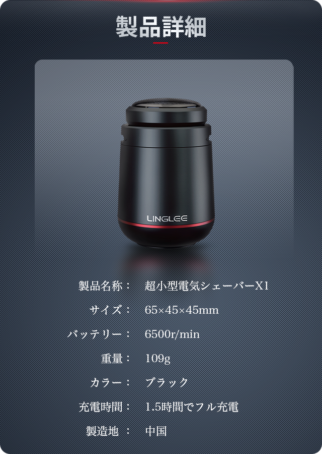 最も小さく最も軽いボディに、最高の使用体験を。この理想を目指して開発されたのが、超小型電気シェーバーX1です。6,500RPM(1分間の回転数)で高速回転するダイヤモンドライクカーボンの刃が肌にフィットし、パワフルなのに優しくスッキリ髭を剃り落とします。