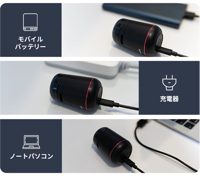 充電は本体のType-Cポートから行えます。コンセントから、またはモバイルバッテリーやノートパソコンから約1.5時間で充電完了です。