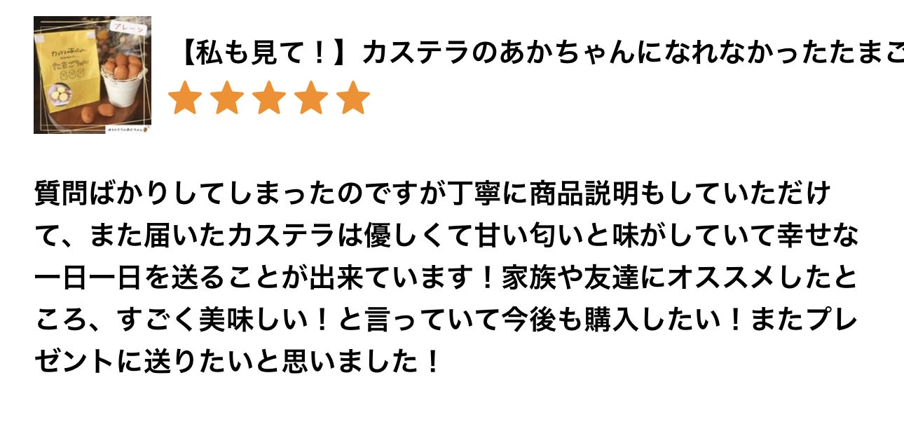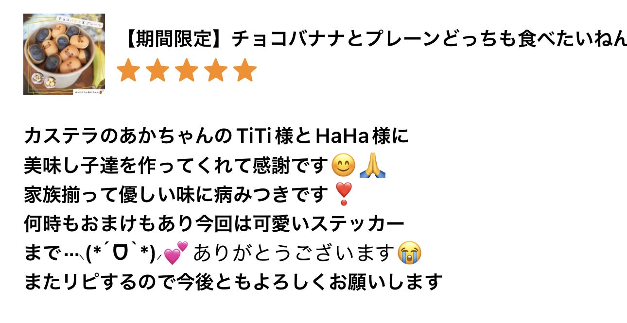 「1つ提案ですが、クラウドファンディングをしてみてはいかがですか?そうすれば私達も協力できます。私はカステラのあかちゃんを買ったことがある方達なら喜んで協力してくれると思います。カステラのあかちゃんをこのまま食べれなくなると思うと本当に辛いです。1人だけの力ではどうにもならないことでも何十人、何百人の応援があれば必ず報われます。存続を信じています。」(内容は少し省略しております)