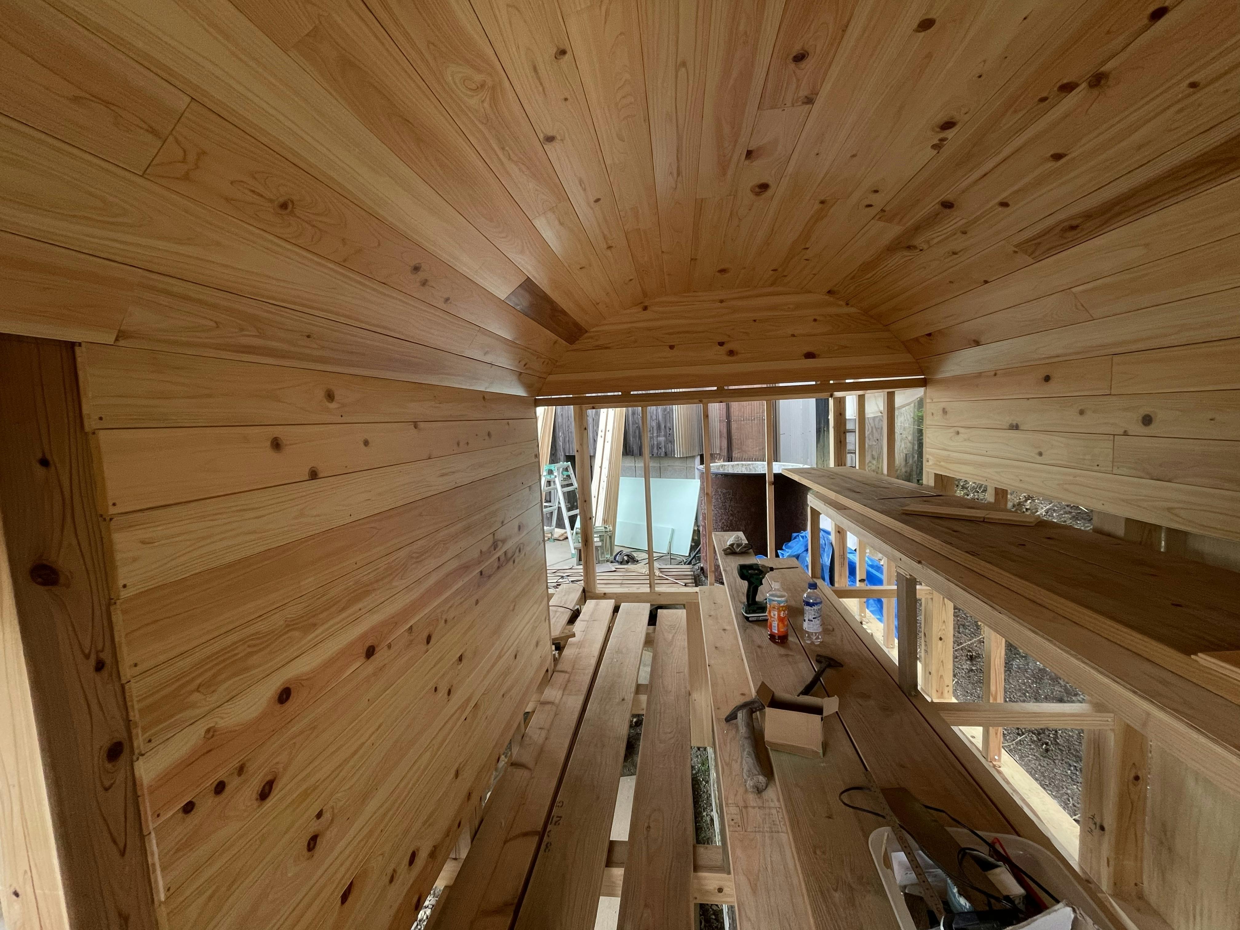 2023/04/19 10:09皆様ページを見てくださりありがとうございます。現在内装はほとんどできており、耐熱壁と断熱材の工事を行なっております。ストーブに火入れをするのも近くになってきました!楽しみです!ご支援いただきました皆様本当にありがとうございます。サウナ室内のこだわりはアーチを描いた天井です!バレルサウナのような要素を取り込み蒸気の流れを室内に対流させる効果が期待できます。もちろんセルフロウリュウもできる薪ストーブを準備しております! もっと見る
