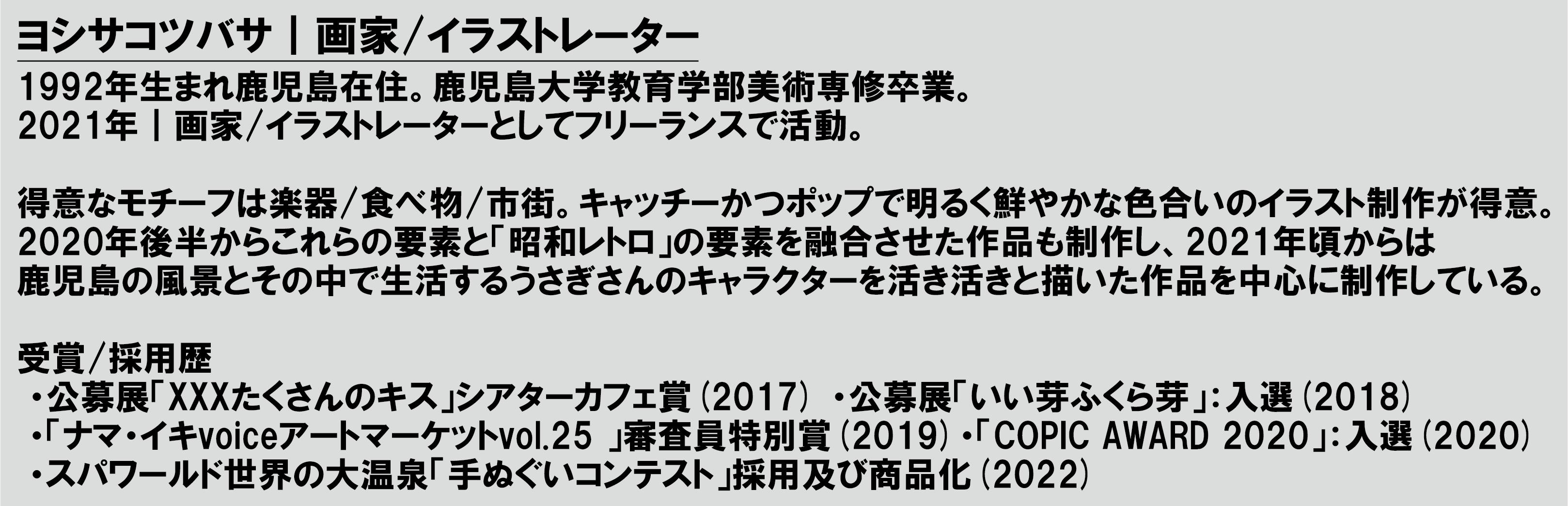 ヨシサコツバサ|画家/イラストレーターとしてフリーランスで活動。 鹿児島の風景とその中で生活するうさぎさんのキャラクターを活き活きと描いた作品を中心に制作している。 「今回、以前からお客さんとして馴染みのあるクリスマスマーケットに携わることができ、大変光栄に思っております。少しでもイベントをより良いものにするためお力添えできましたら幸いです。よろしくお願い致します!」