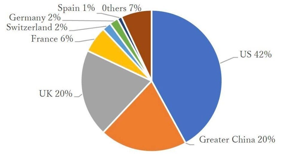 世界のアート市場は約6兆円の市場規模と言われていますが、日本市場は約3%の2000億円です。下記のグラフは「世界の美術品市場の国別割合」を円グラフ(※)で示したものです。