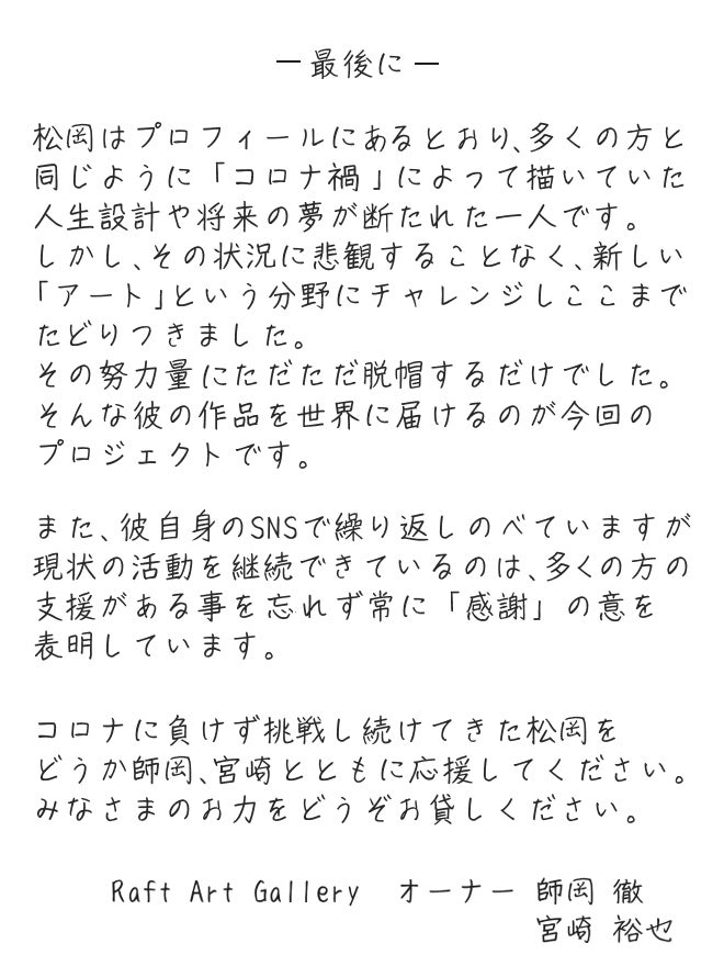 松岡裕喜が世界で売れれば、姫路にあるギャラリーの知名度も上がります。時にアートが観光地になるように、 姫路という場所が世界文化遺産の姫路城だけでなく、Raft Art Galleryを一つの観光スポットにしたいと考えています。