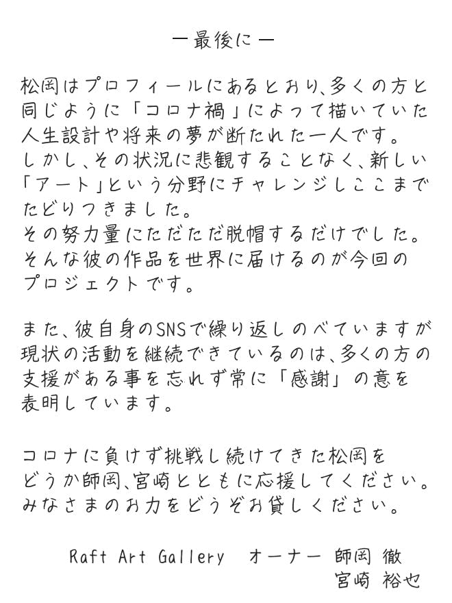2023/01/14 17:22ギャラリーオーナーの師岡です。1月6日に予定通りRaftArtGalleryはオープンいたしました。これもご支援いただいたみなさまのおかげです。所属アーティストの松岡祐喜の作品をみなさまにご鑑賞いただけるように、基本的に松岡は在廊するようにしております。また1月7日にスポンサー、サポーターの方をお招きして、お披露目会及びレセプションパーティーを開催いたしました。ぜひ一度姫路に来た際は足をお運びください。またクラウドファンディング展の権利を買って頂いた方とも順次個展の開催のご連絡のご相談をさせていただきます。個展の日程が決まった際にはSNS等でお知らせいたしますので、ぜひアカウントをフォローしていただければと思います。RaftArtGalleryhttps://www.instagram.com/raftartgallery/松岡裕喜https://www.instagram.com/matsuoka___yuki/今後、この場所をお借りして、RaftArtGalleryとしての戦略を随時ご報告させていただきたいと思います。 もっと見る1,300万円を超える支援をいただきました