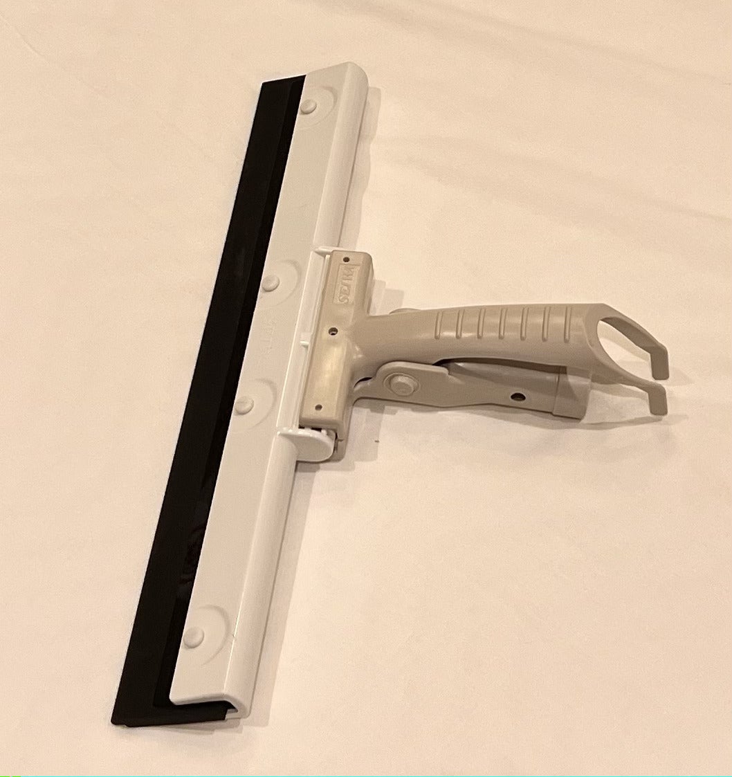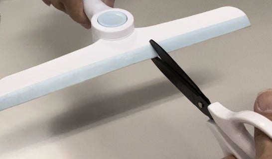 世の中にある掃除具をたくさん購入し、様々な視点から分析をしたり、改善を試みたもののこれと言ったアイデアが浮かばない中、その日は突然やってきました。アイデアに煮詰まり、藁をも掴む気持ちで、たまたま、100円ショップで購入した窓ガラスの水を切るスクイージーで、ガラスではなく、床を擦ってみました。
