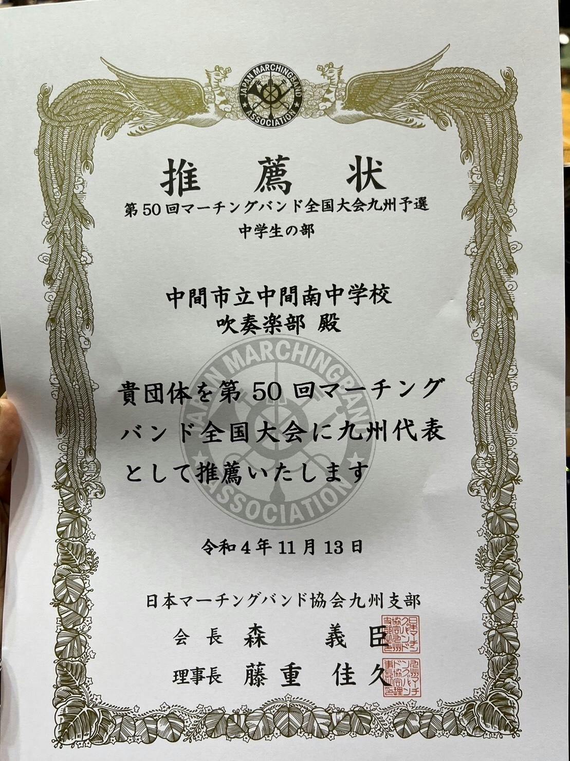 第50回マーチングバンド全国大会九州予選 金賞受賞で推薦状頂きました!