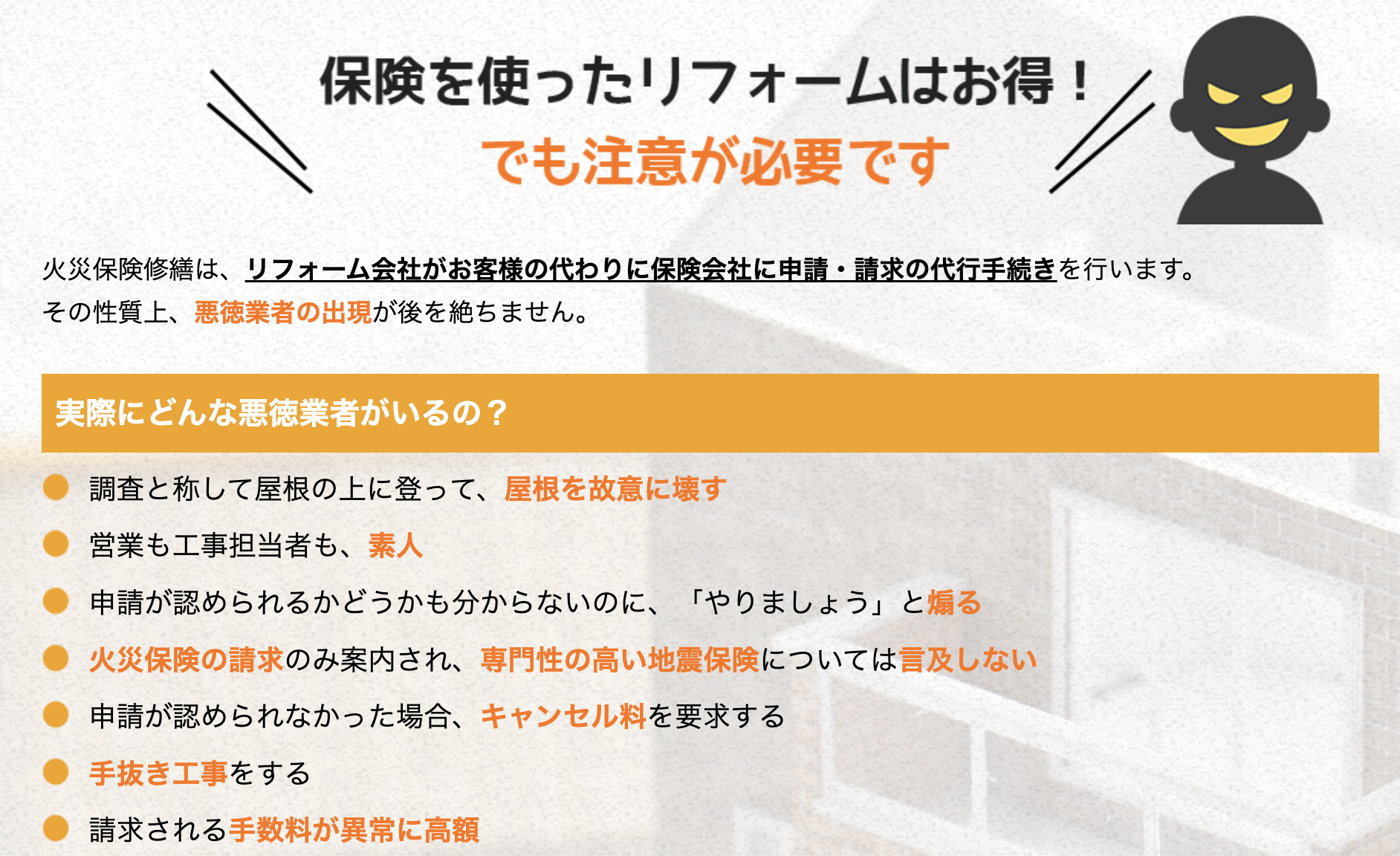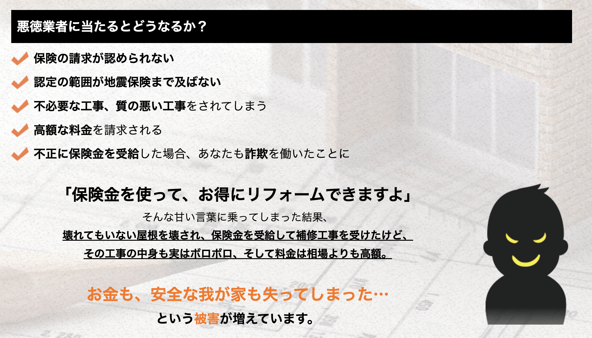 保険申請の専門会社は、認定金の手数料欲しさにトラブルが多発し、逮捕者も出たほど。具体的には、家屋の屋根に登ってわざと穴をあけ、お客様を騙してお金を取るなどです。
