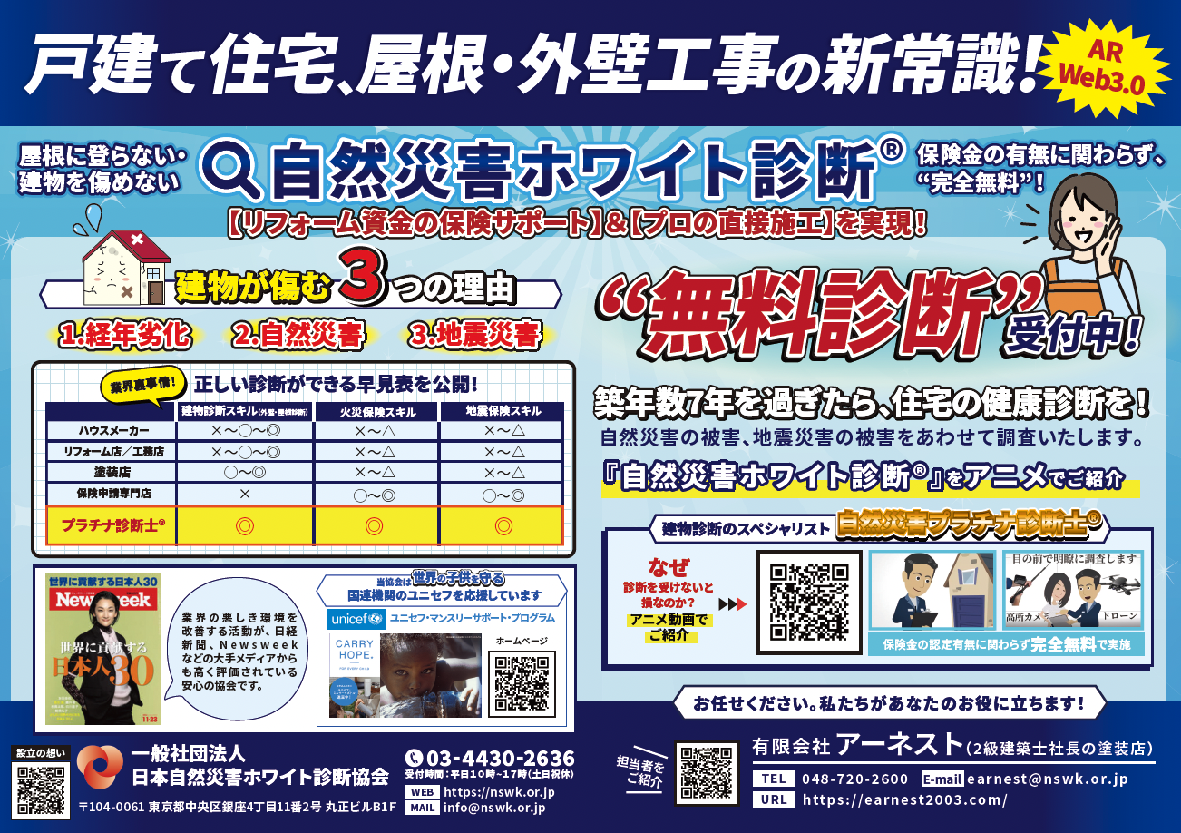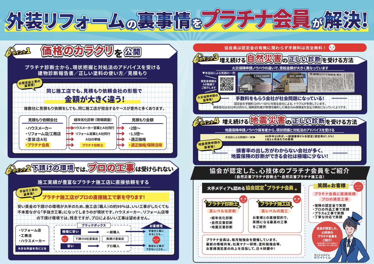 もちろん、マイホームをお持ちで自然災害ホワイト診断®を活用できるお客様や、価格に見合った誠実な仕事をしたい塗装会社・外装リフォーム会社様にも、届いてほしい内容です。