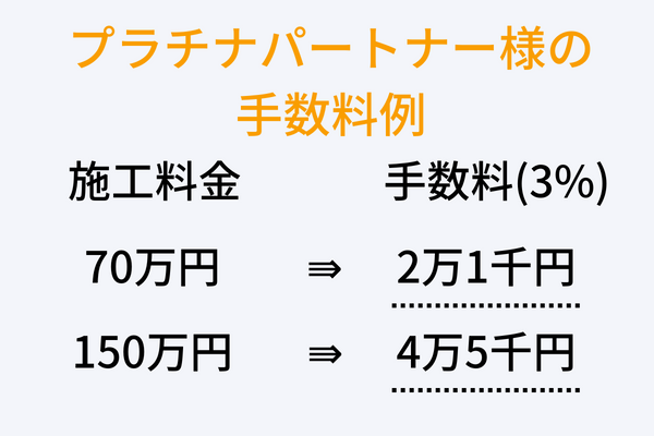 たとえば、70万円の工事なら2万1千円、150万円の工事なら、4万5千円がプラチナパートナー様の手数料になります。