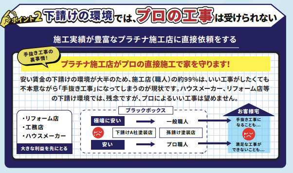下請け環境の発注金額は、お客様からハウスメーカーが受注する金額よりも極端に安くなっています。 塗装店は金額が安いので、良い工事がしたくてもそれができません。また、お客様は「少し高いけどハウスメーカーなら安心」と思っていたのに、実際には良い工事をうけることができないのが実態です。