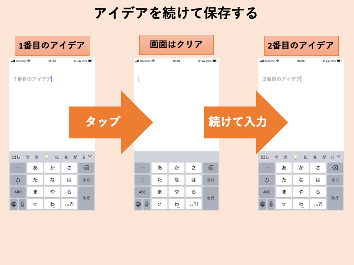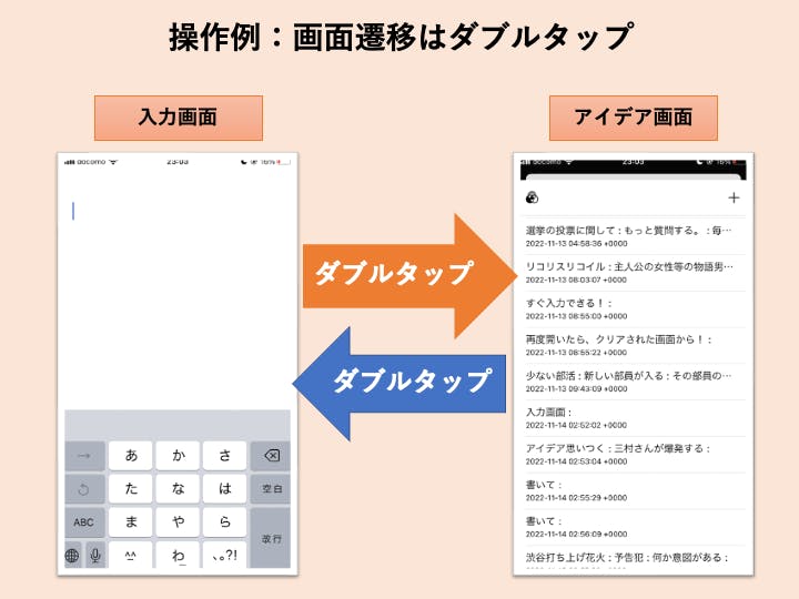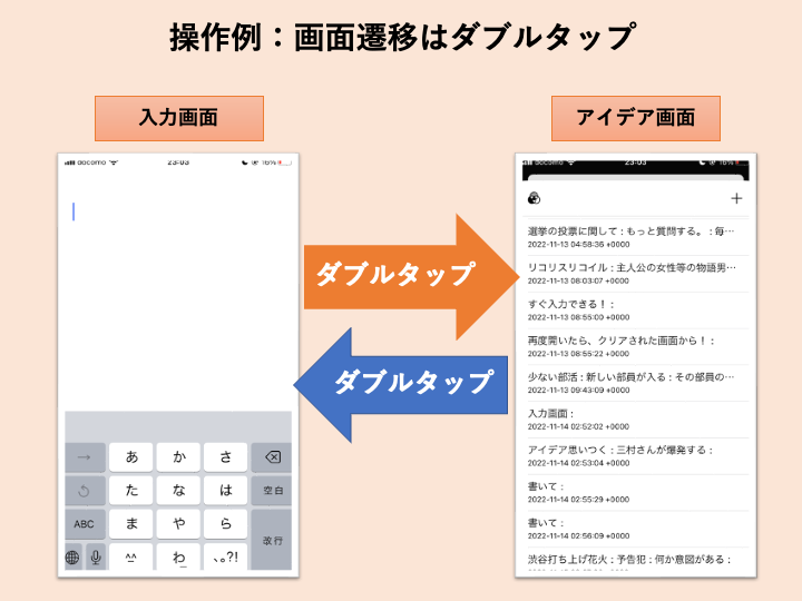 アイデア保存、画面遷移、アイデア削除など、全てタップで操作が可能となります。
