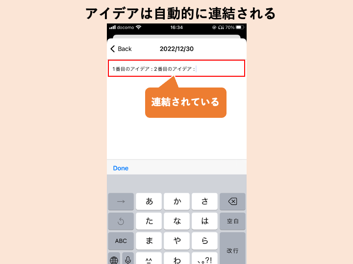 また、一度画面を閉じるか、アイデア確認画面に移るまでに保存されたデータは、連結された状態で保存されます。