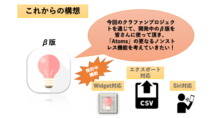 β版「Atoms」をお使いただき、ノンストレスアプリを体験ください。 また、AppStoreに配信する最終版のアプリ内のページに、ご支援いただいた方の名前かハンドルネームを記載させて頂きます。