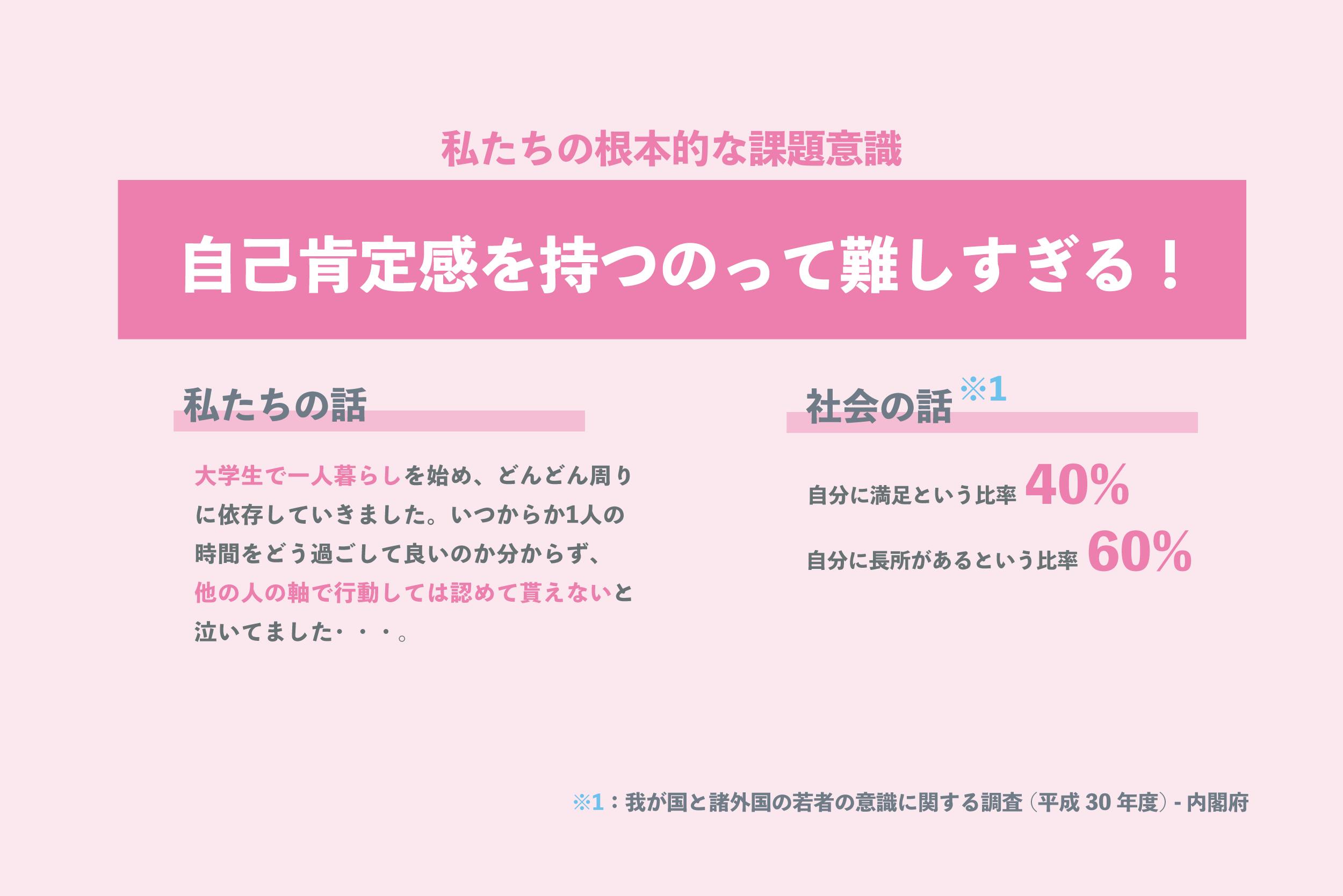 実際に、私たちは就職活動はもちろん「大学で一人暮らしをはじめたとき」「慣れない長期インターンを始めたとき」に、自分に対する自信のなさや孤独感・不安感を感じたことがある当事者です。社会としても「自分に満足している日本人の若者は約40%」であり世界と比較しても少なく、多くの人が当事者となっている問題です。