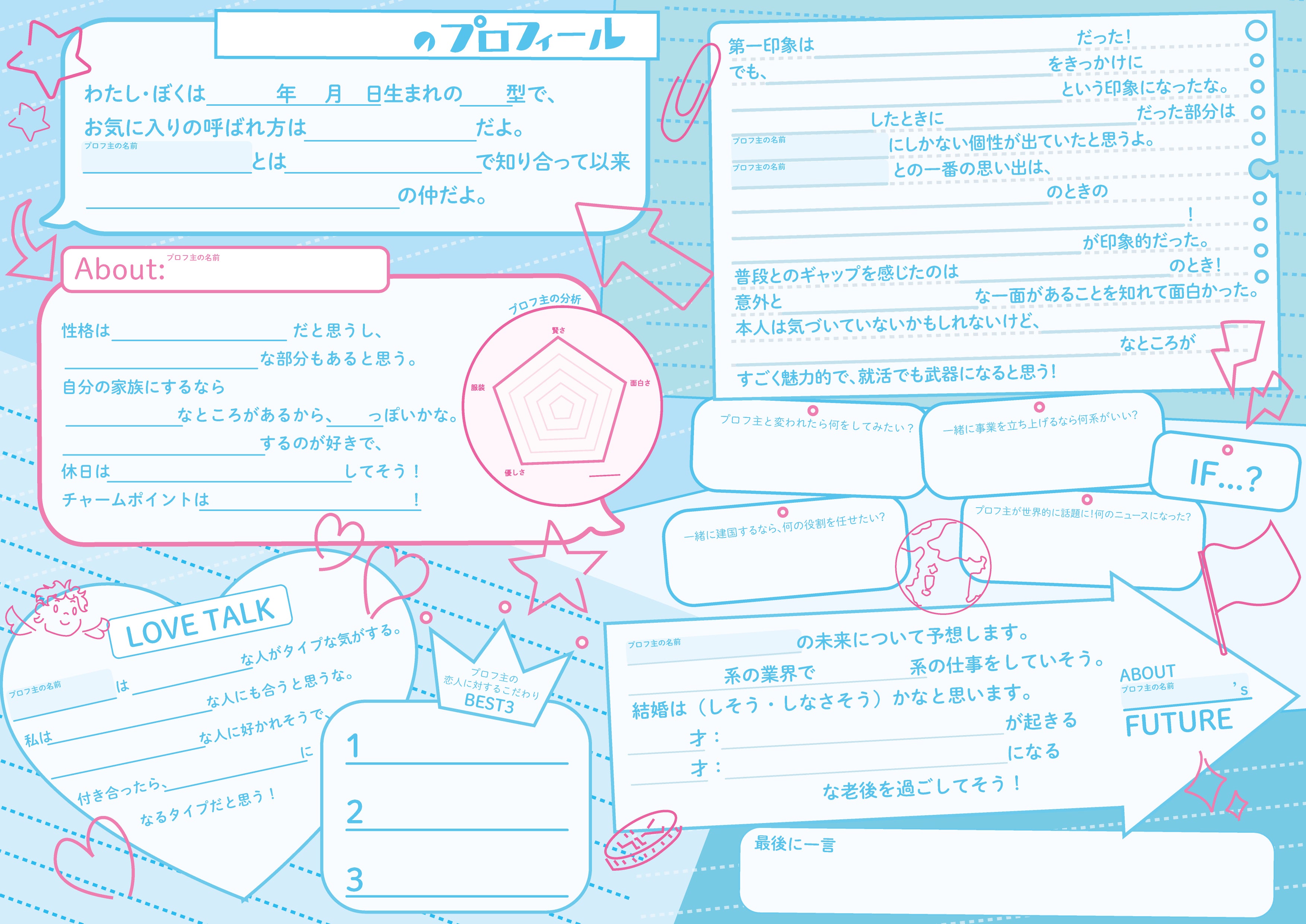 この『大学生のプロフ帳』の一番の特徴とも言える裏面は「友達が埋める」仕様となっています!友だちと「自分らしさを深掘りするきっかけ作り」を目的としているので、自分ではなく「友達だからこそわかる自分について」も1枚のシートの中でわかる様に工夫しました。表面と対応している点もあるのでプロフ帳を交換するとき意外な一面が分かり、盛り上がること間違いなしです!