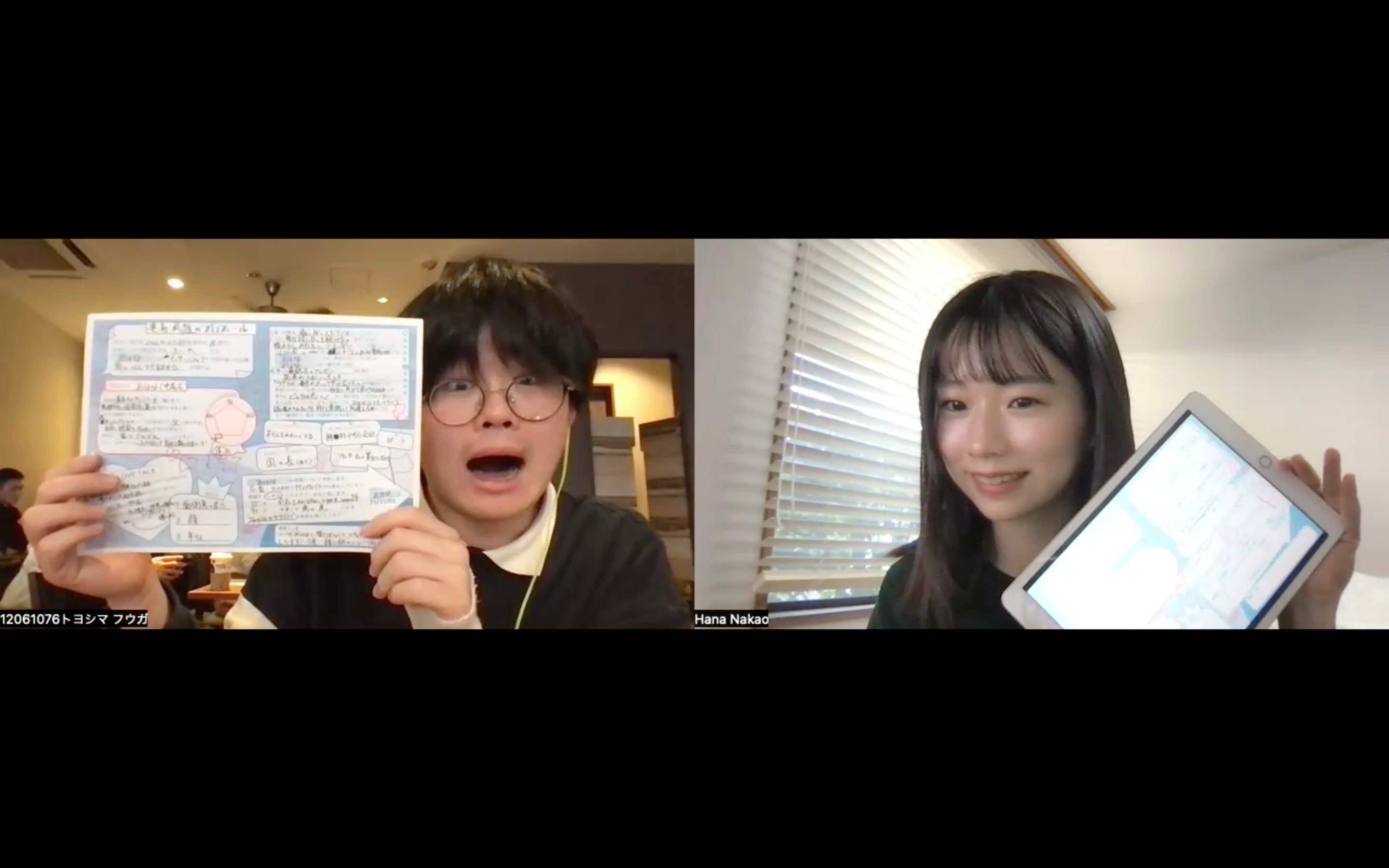 2022/12/12 12:41今回は、チームデザイン(おはなとふうが)がより良いプロフ帳をつくるため、自分たちで作ったプロフ帳を体験してみました!(とだちゃんはポストカードの撮影中!ありがとう!)改めまして、プロジェクトの本文にも書いてありますが、「大学生のプロフ帳」の使い方は下記の通り。①おもて面書き込みタイム〜開始1分〜ふうが:記入欄ちっちゃいかな、、、おはな:たしかに、、、ふうが:体験してみるって大事〜開始30分〜おはな:自分たちで考えた質問なのに、全然書きおわらない!\(^o^)/ふうが:おれも\(^o^)/おはな:小学生のとき、こんな難問たちをすらすら答えてたのすご、、、ふうが:2人でやってもらうプロダクトだけど、結構時間かかるしおもて面は別で書いてきても大丈夫そうだね。〜開始45分、お互いにおもて面記入完了〜②おもて面公開タイムおはな・ふうが:wwwwwwwwwwwwwwww〜おはなのおもて面について〜ふうが:苦手なものマット運動wwwたしかに苦手そうかもwwwwおはな:そうそう、後転とかもできない(笑) ふうがは大学生になってから知り合ったから知らないよね、、ふうが:IF…?の欄の、おはなが、「あと1年しか生きられない」ってときに「どうにかして生きる努力をする」ってめっちゃわかるな(笑)めっちゃ努力してそう。〜ふうがのおもて面について〜おはな:やっぱプロフ帳はアナログの方がそれっぽさでるね〜〜。ふうが、誤字をジブリの消し方してるwwww交換するの本当に楽しい、ふつうに友達同士で盛り上がれそう。ふうが:お互いの結果を比べて思ったけど、俺とおはなはMBTIが一緒だから、結構通ずる部分あるかも(笑)フワッと考えている感覚を、お互いの言葉で言語化してるみたいな。おはな:たしかに!違うタイプの人とやってみるのも面白いけど、似たタイプも発見があるね。③うら面記入タイム〜記入中:終始無言〜〜うら面記入開始から50分経過、お互い記入完了〜おはな:さっきの公開タイムで話しすぎたのもあるけど、もう2時間もzoomしてるじゃん。ほんとに時間かかるね(笑)ふうが:質問内容の構成とか、書き方の口調に工夫がいりそう!④うら面公開タイムおはな・ふうが:wwwwwwwwwwwwwwwwwwwwwwwwwwwwwwwwwwwwwwwwwwwwwwwwwwwwwwwwwwwwwwwwwwwwwwwwwwwwwwwwwwwwwwwwwwwwwおはな:お互い、一緒に事業を立ち上げるなら?の部分「もちろんデザイン」「絶対デザイン」って書いてるのおもしろい(笑) ふうが:なんか似てるよねやっぱり(笑)おはな:相手の五角形グラフ難しかったから、魅力ランキングにしよう!反対に、好きなタイプのところは五角形でいいかも。オモテ面と対応させる感じで。ふうが:いいね、あと回答の仕方がずれちゃってる部分もあるから、言葉のブラッシュアップもしよう。⑤体験完了おはな:「気軽にポップに自分を知れる」と思ってプロフ帳つくったけど、制作者でも答えるの難しかった、、、ふうが:ソレナ、時間もかかっちゃったね、もう少し構成とかデザインでなんとかなる部分は多そう!おはな:あと、今振り返ると、おもて面を埋めるときも、認識を意識せざるを得ないなと思う。「ふうがにはこういう面を知ってほしいな」と思って回答内容を変えるみたいな。ふうが:おもて面の質問は同じでも、一緒にやる人が違うとおもて面の内容も変わりそうだね。ー寄贈先追加のご報告ーご支援ご協力いただいている皆様この度、立命館大学びわこ・くさつキャンパスのキャリアセンターに「大学生のプロフ帳」を寄贈させていただくことになりました!今後とも、プロダクト制作・寄贈先の拡大ともに頑張っていきますので、「大学生のプロフ帳」プロジェクトを宜しくお願いいたします。 もっと見る