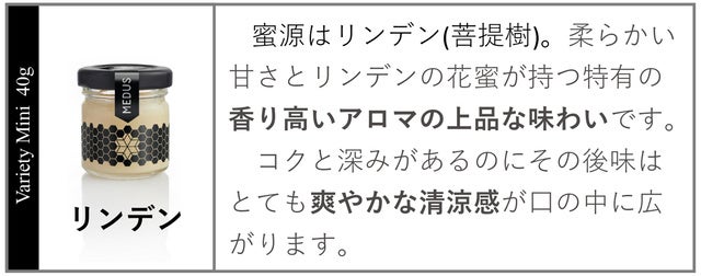 リンデン「生」はちみつとクリーミー「生」はちみつの2種類は、100%生はちみつ商品です。その他の7種類は、フリーズドライ製法によるベリー、フルーツ、ハーブ類+生はちみつ商品です。