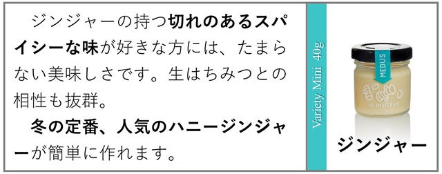 ジンジャー入り「生」はちみつ使用:冬の定番、ハニージンジャー