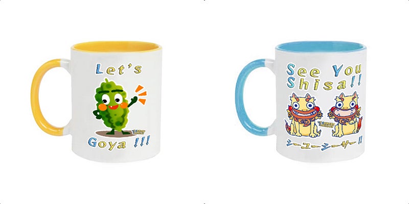 番組オープニングコール(イエローカップ)「レッツ・ゴーヤー」とエンディングコール(ブルーカップ)「シーユーシーサー」ロゴ&イラストの入ったかわいくて鮮やかな、朝から元気になるマグカップ!