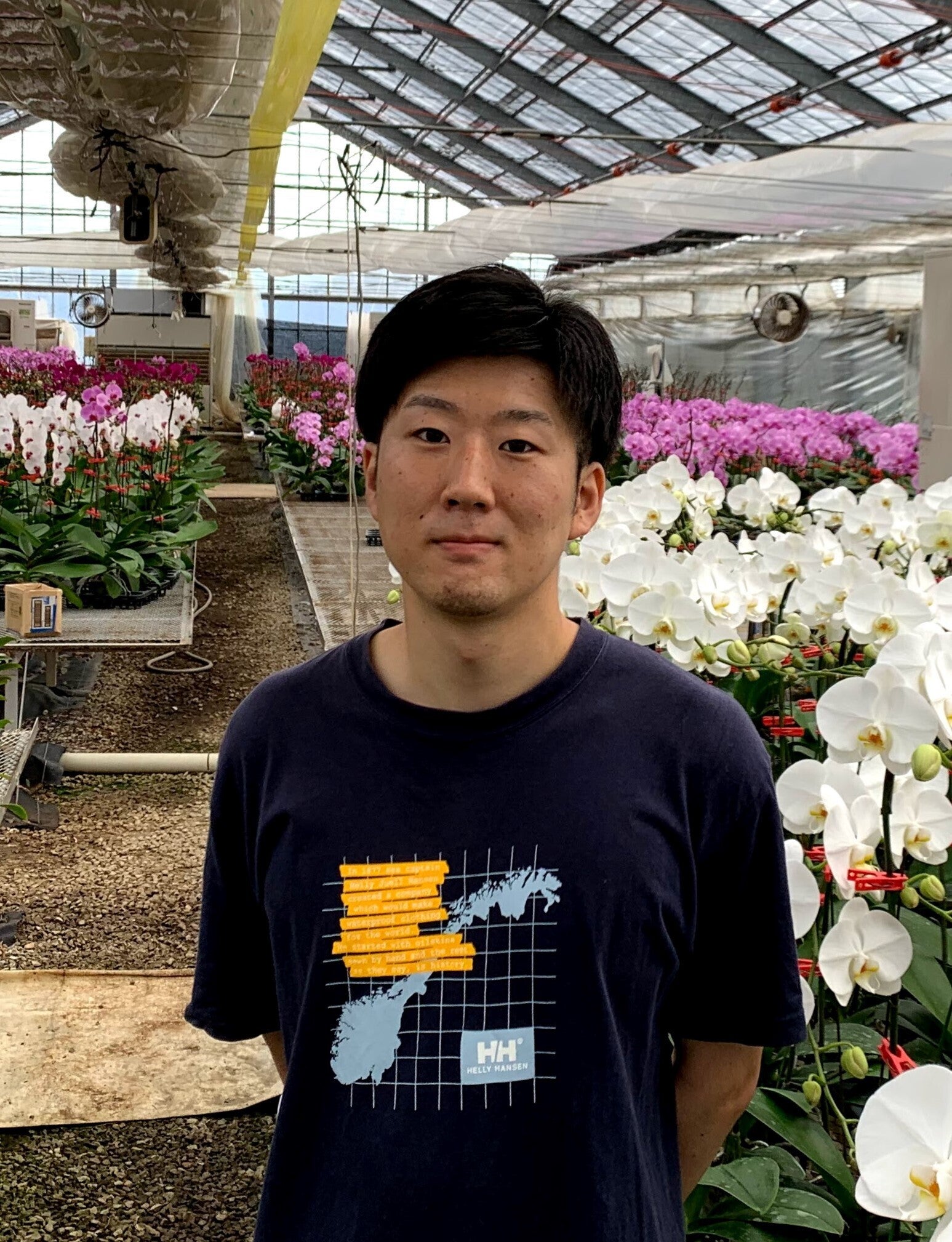 私は大阪出身で、地元の高校を卒業後、和歌山県内の大学に進学しました。大学・大学院時代は植物のタンパク質について勉強ならびに研究を行っていました。また学生時代には、下宿していた地域の特産品であるモモの収穫時期に知り合いの農家さんのところへ毎年手伝いに行きました。その中で、農家さんから植物の栽培の難しさややりがいを聞くうちに次第に農業に関心を抱き、昨年ご縁があった美浜オーキッドに勤めることになり、その流れで美浜町に移住してきました。