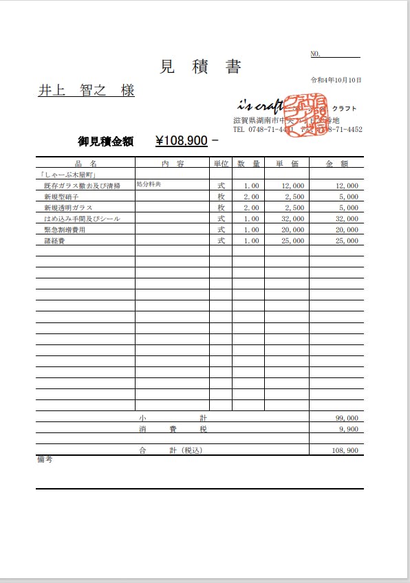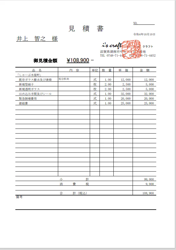 ・ガラスの修繕費用(井上店長に見積をいただきました。)