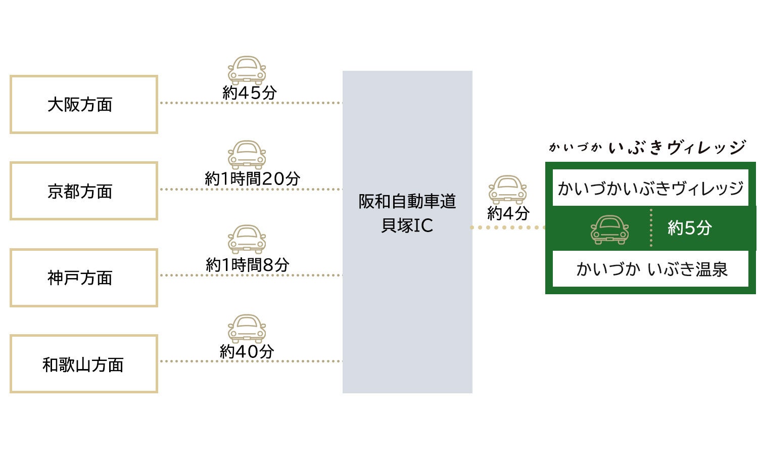 大阪方面より阪和自動車道経由、約45分で貝塚ICへ。貝塚ICより約4分。