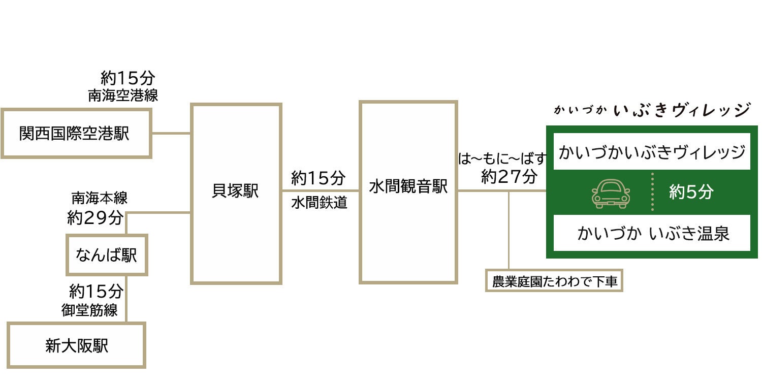 - 関西国際空港から南海空港線空港急行・難波行で貝塚駅まで約15分、貝塚駅より水間鉄道で水間観音駅まで約15分、水間観音駅からは〜もに〜ばすで約27分「農業庭園たわわ」下車。 / 関西国際空港から約1時間10分。