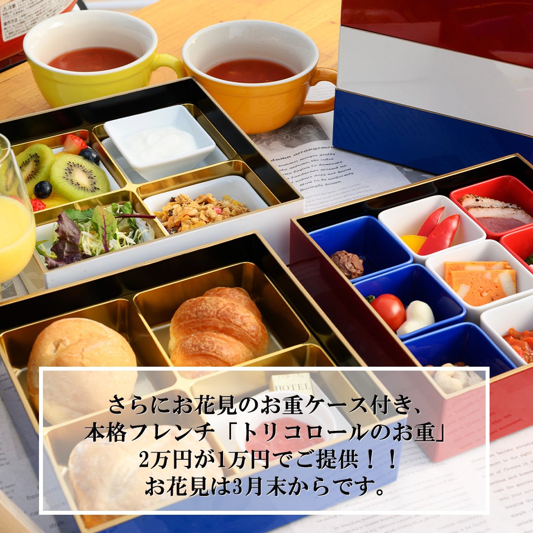 達成お礼の返礼品として、お花見で提供している2万円の本格フレンチ「トリコロールのお重」を、今回お重ケースもセットで 1万円でご提供します。