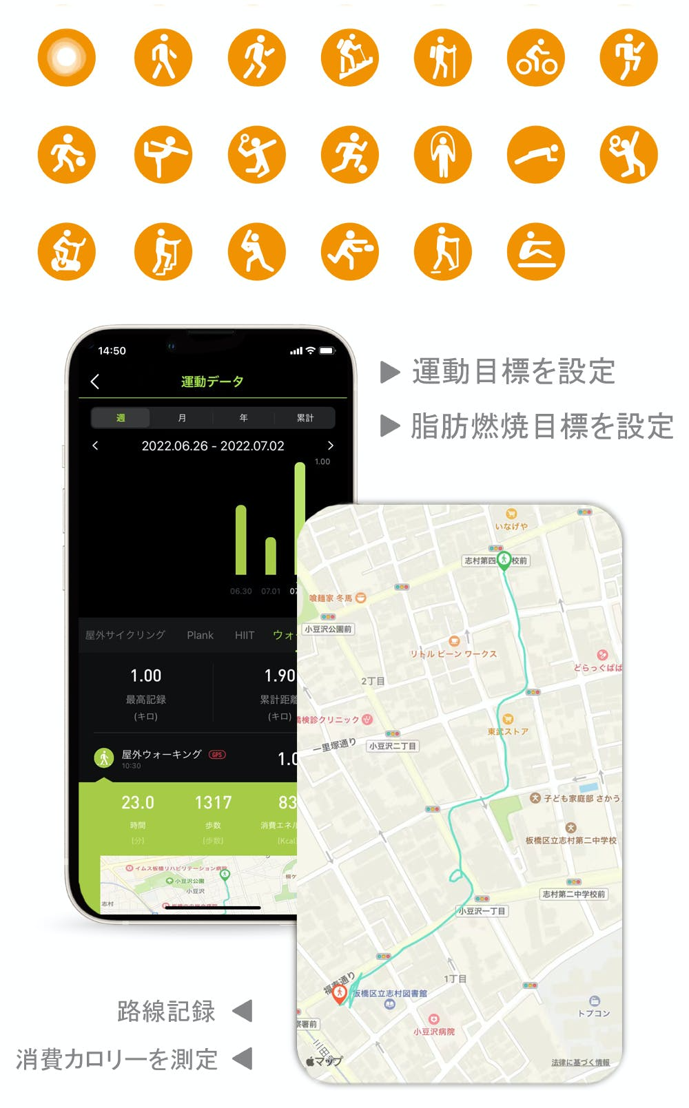 14日間連続使用可能なE-Joy Smart Watch Plusが、体温、血中酸素などの健康指標を測定するだけではなく、運動に合わせて20種類のスポーツモードを選択することも可能です。一つのアプリに7台までのデバイスを追加でき、家族分のデータを一括管理・分析ができます。