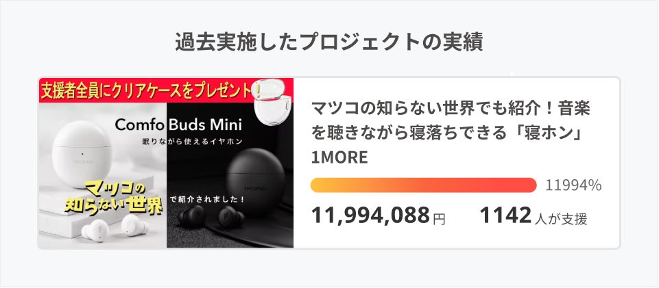 2022/11/22 16:56いつもご支援ありがとうございます。皆様のおかげで目標を達成致しました!!!第三弾もありがとうございます!!寒い冬に合わせて暖かい部屋にいながらCAMPFIRE限定のレッド色で音楽を聴いてみてはいかがですか?もちろんノリノリの音楽を聴きながらエクササイズしたり、ヒーリングミュージックを聴いて眠りにつくことも寝ホンだからこそできる魅力です!良ければSNSでのシェアもお待ちしてます★年末特典!マツコの知らない世界でも紹介!音楽を聴きながら寝落ちできる「寝ホン」 もっと見る
