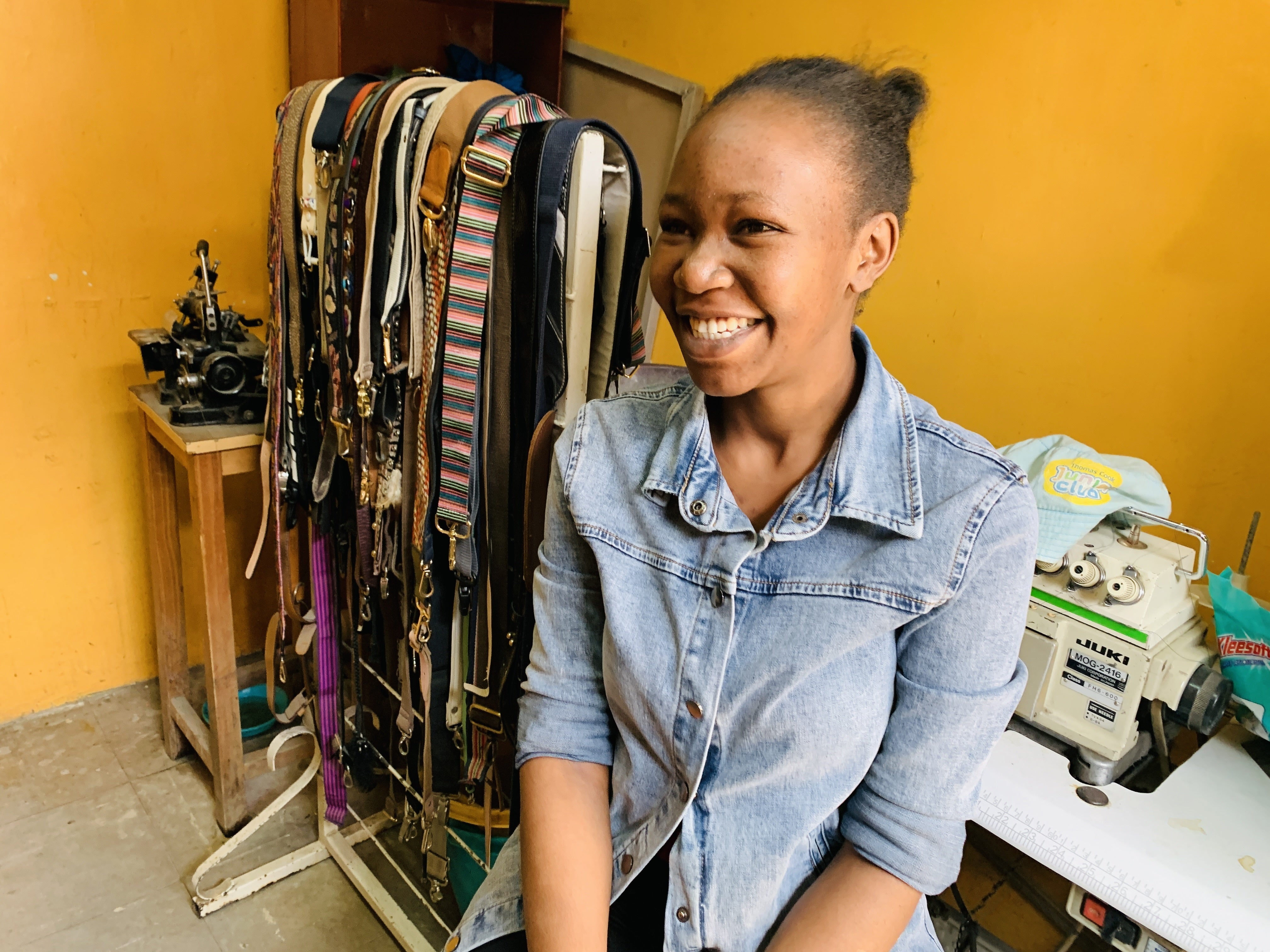 スーパーマン センガさん彼女はバッグブランド代表のアシスタントであり、顧客対応担当、パターンナー、古着マーケットでの素材探しもする、マルチタスクなスーパーマン。2018年にインターンとして参加、いまではセンガ(みんなの叔母さん)と呼ばれ、なくてはならない存在です。とにかくものづくりが好き。良いものをつくり出し、多くの人に楽しんでもらいたい。日本の皆さんにもこの工房で作ったものを使ってもらえることは本当に嬉しい!と語ってくれました。沢山売って儲ける!ではなく、こだわり、良いものだけを無理のない程度に作っていく、と言うスタンスでやっているそうです。ケニアスタッフ トモ