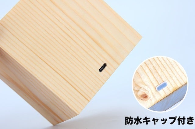 A. 木の質感を楽しむ無垢材のため防水加工は施していません。アウトドアなどでのご使用の際は急な雨などでの故障を防ぐためUSB差し込み部のシリコンキャップは外さずにご使用ください。