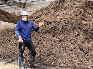 植物性残渣、鶏糞を混合し、微生物に含まれる酵素の働きによって熟成させ、本発酵している場所は、湯気が出ていて、実際に温度計を入れてみると一気に50度になりました。