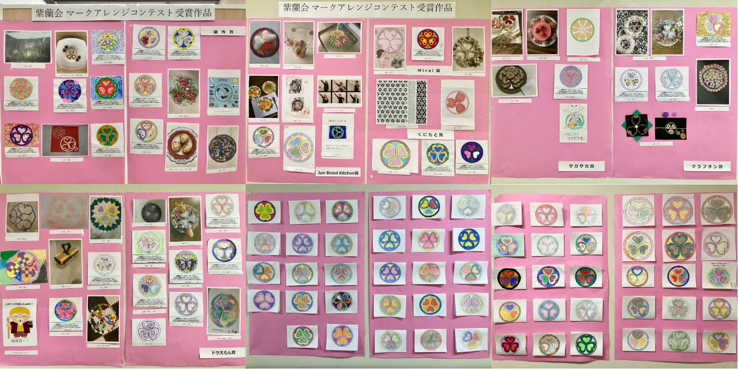 こちらは、今年の4月のさくら祭りの表彰式で展示された「紫蘭会マークコンテスト」の応募作品たちです。たくさんのご応募ありがとうございました。