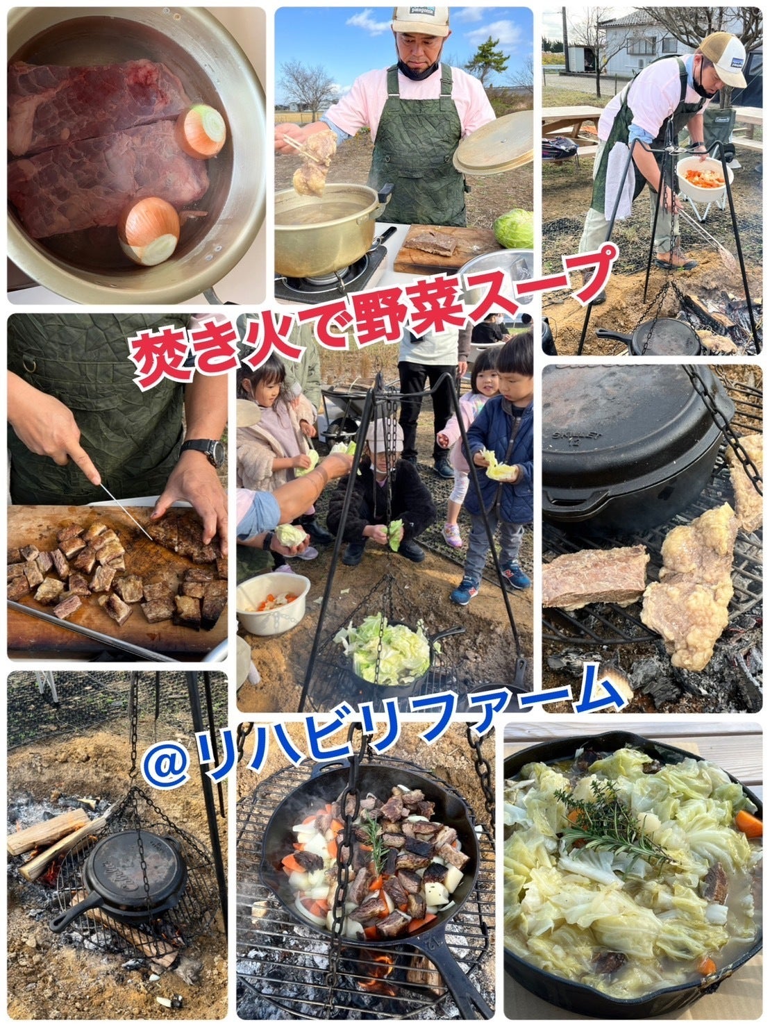 そのお肉を焚き火で焼いて又スープに戻し、野菜を入れて焚き火でコトコト