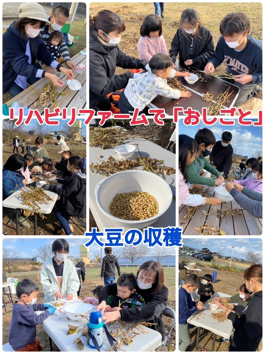 みんなで大豆を収穫して、殻からお豆を一つずつ出しました。