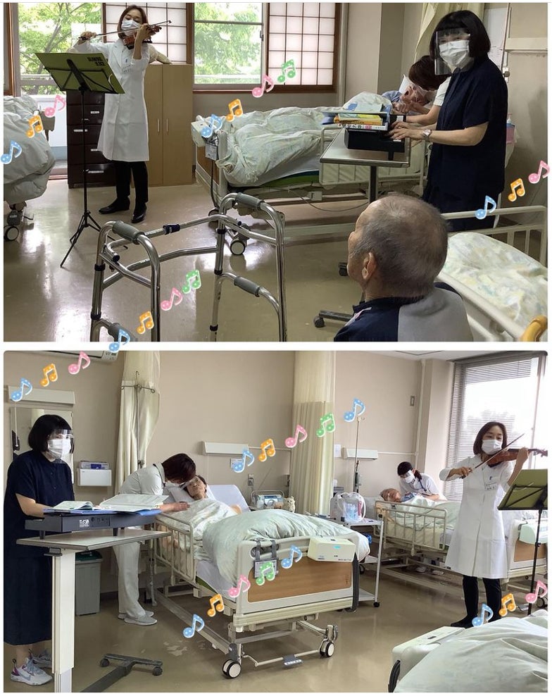 音楽療法では、ホールに出てこれない方のために、ベッドサイドでも音楽を奏でています。