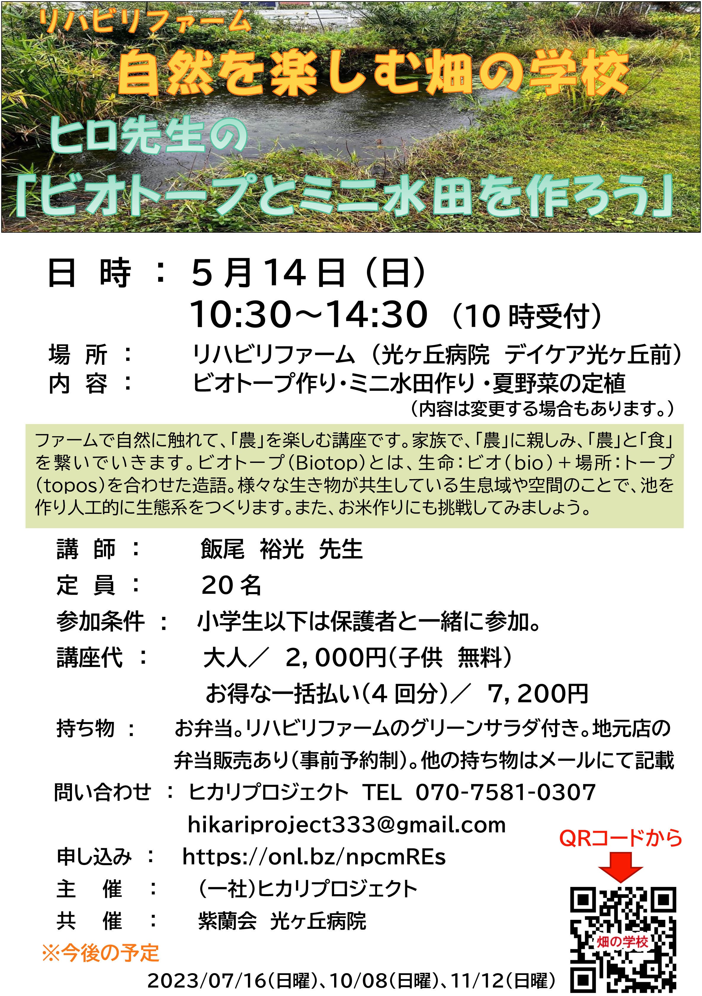 内容:ビオトープ作り・ミニ水田作り・夏野菜の定植(内容は変更する場合もあります。)
