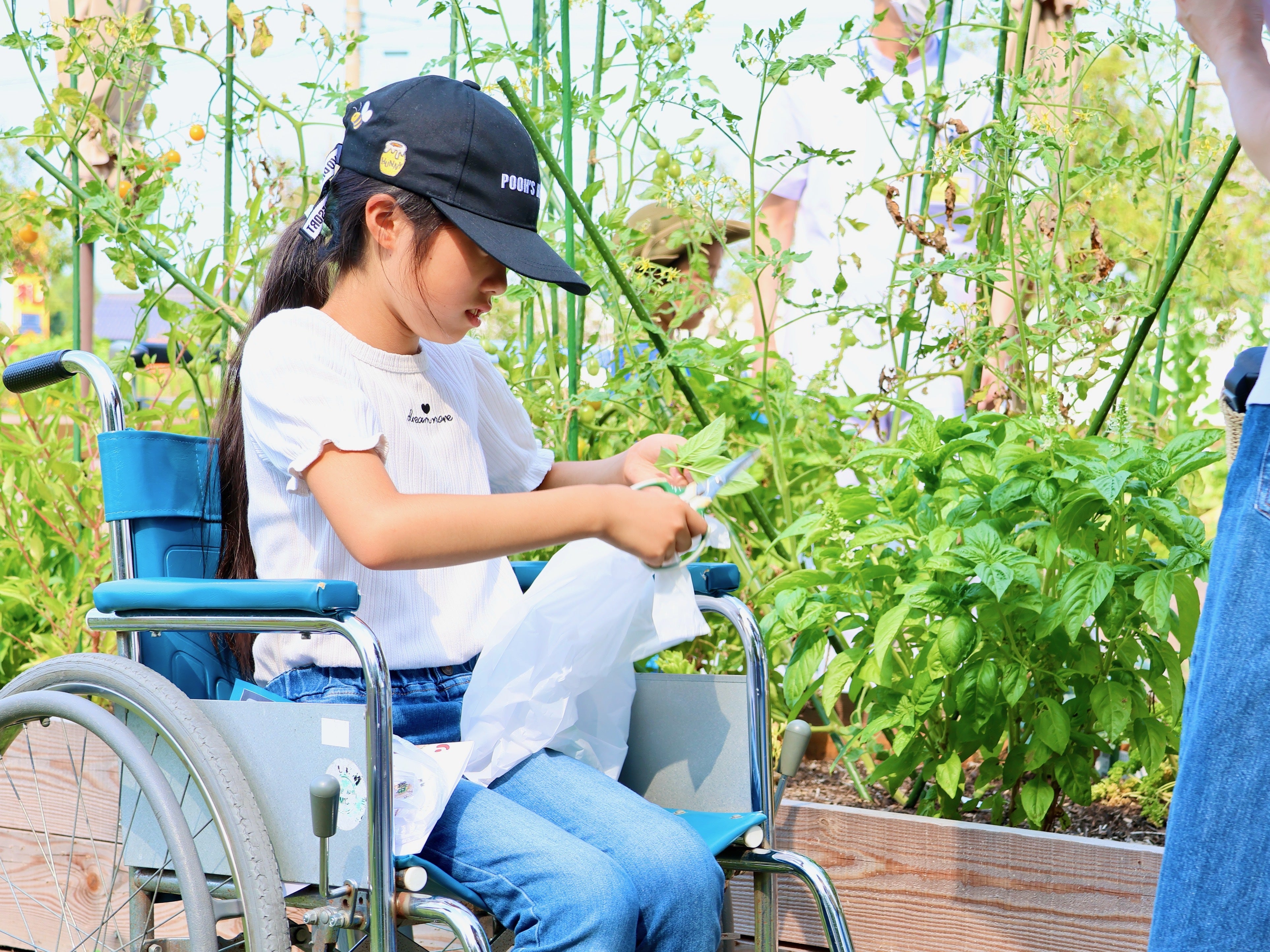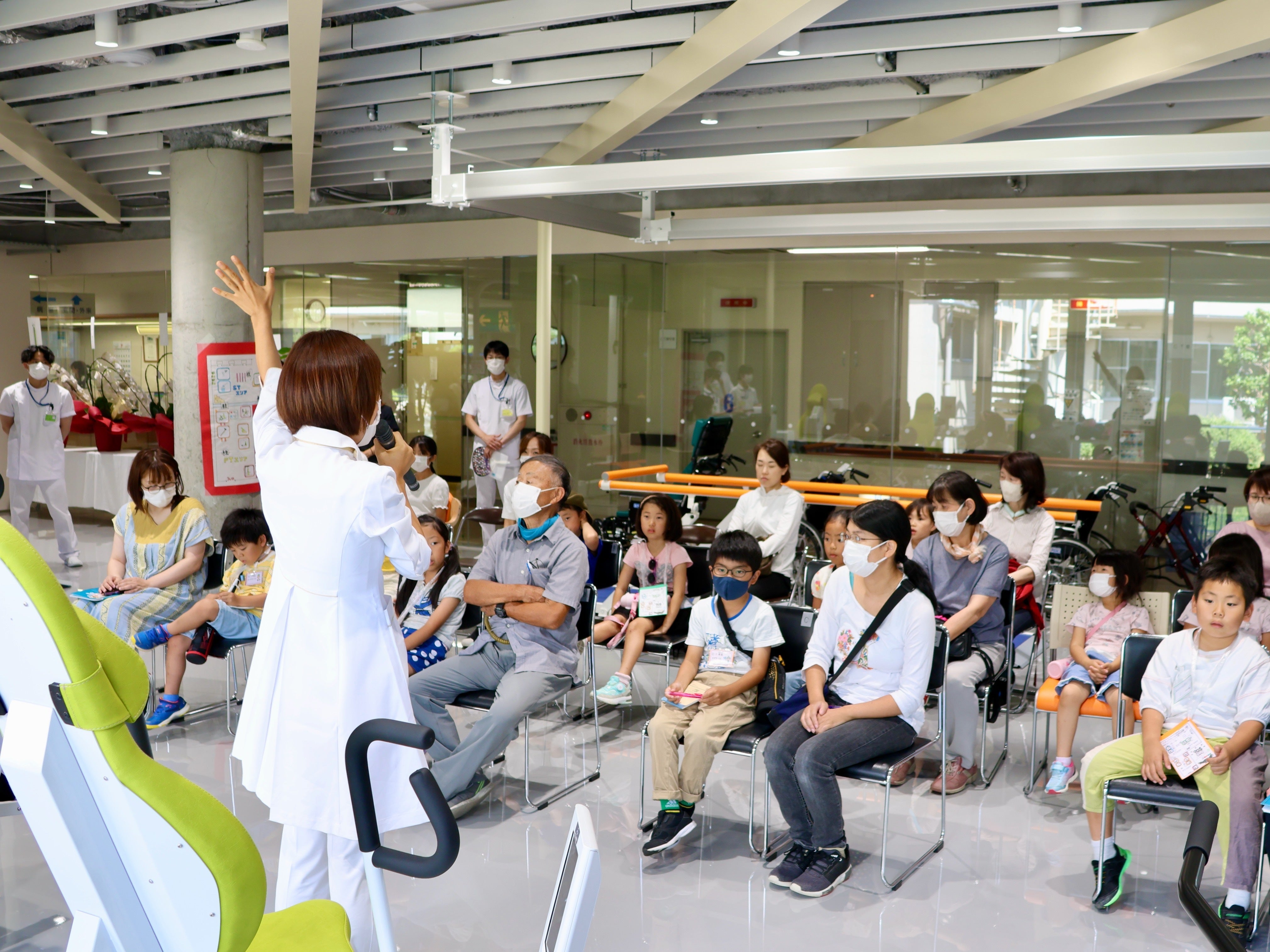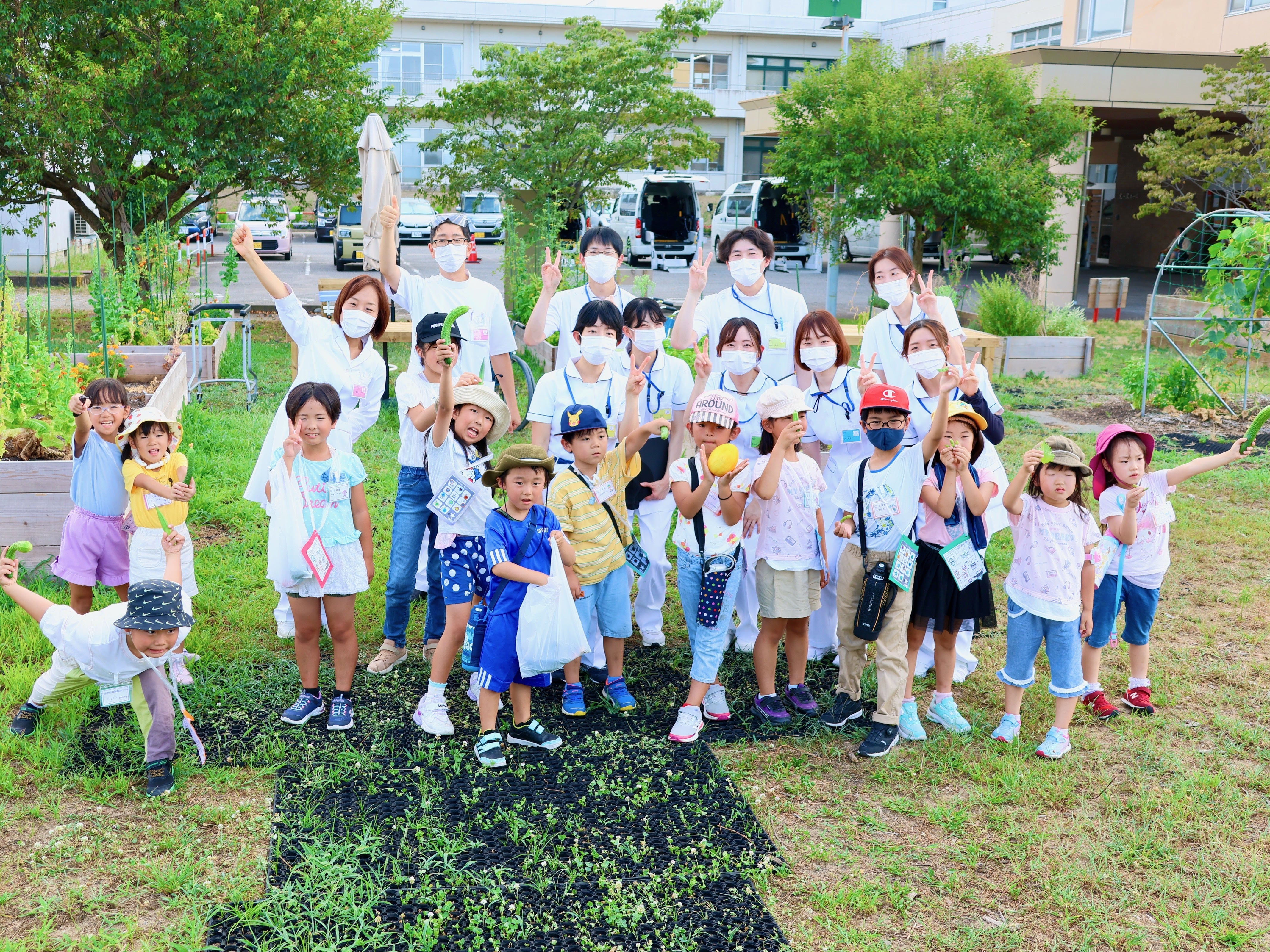 各回12組、計24組の親子が新しいリハビリ室でのリハビリのお仕事体験(理学療法・作業療法・言語療法)の後、リハビリファームでは、車椅子での野菜収穫体験も行っていただきました。