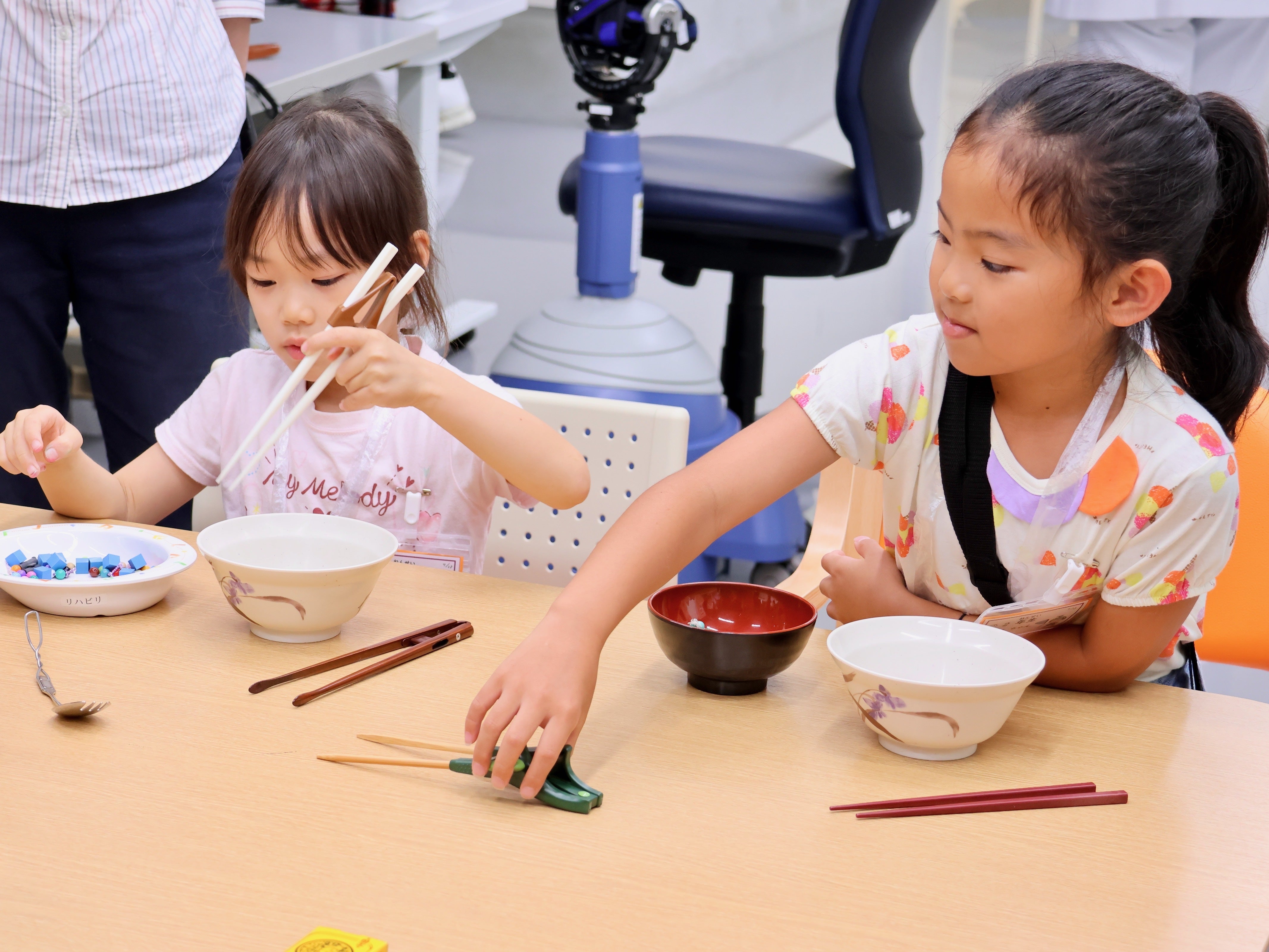作業療法(OT)では、利き手でない手でのお箸やスプーンでの食事の練習や、頭の検査の体験、