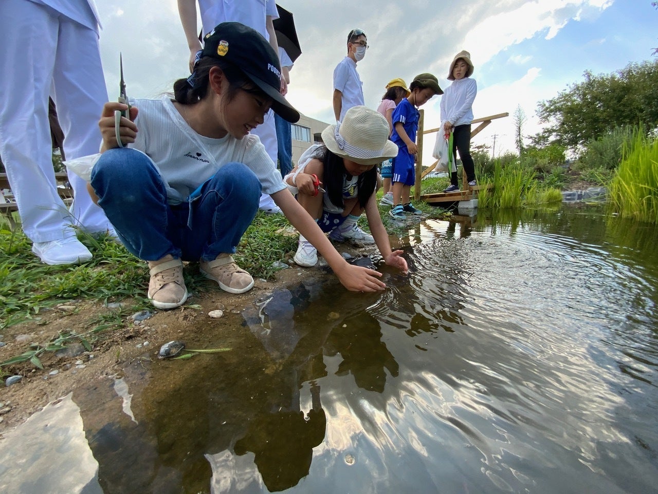 リハビリファームでは、病院のみんなの畑だから、車椅子や杖の人も動きやすいような工夫をしていることや、ビオトープや自然栽培のしくみを学んでもらい、車椅子乗車や介助の体験・野菜収穫をしてもらいました。特に車椅子体験は大人気でした!ビオトープのお魚たちも大人気でした。