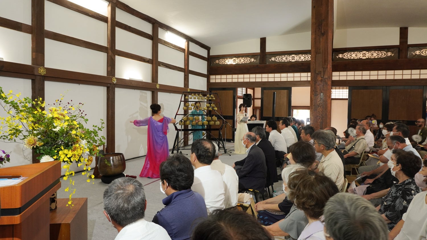 久乗おりんと美しい歌声、ピアノの音色が仏殿いっぱいに響き渡り、天女の創作舞踊は、まるで空を飛んでいるような、とても美しい舞。素晴らしい奉納舞踊になりました。