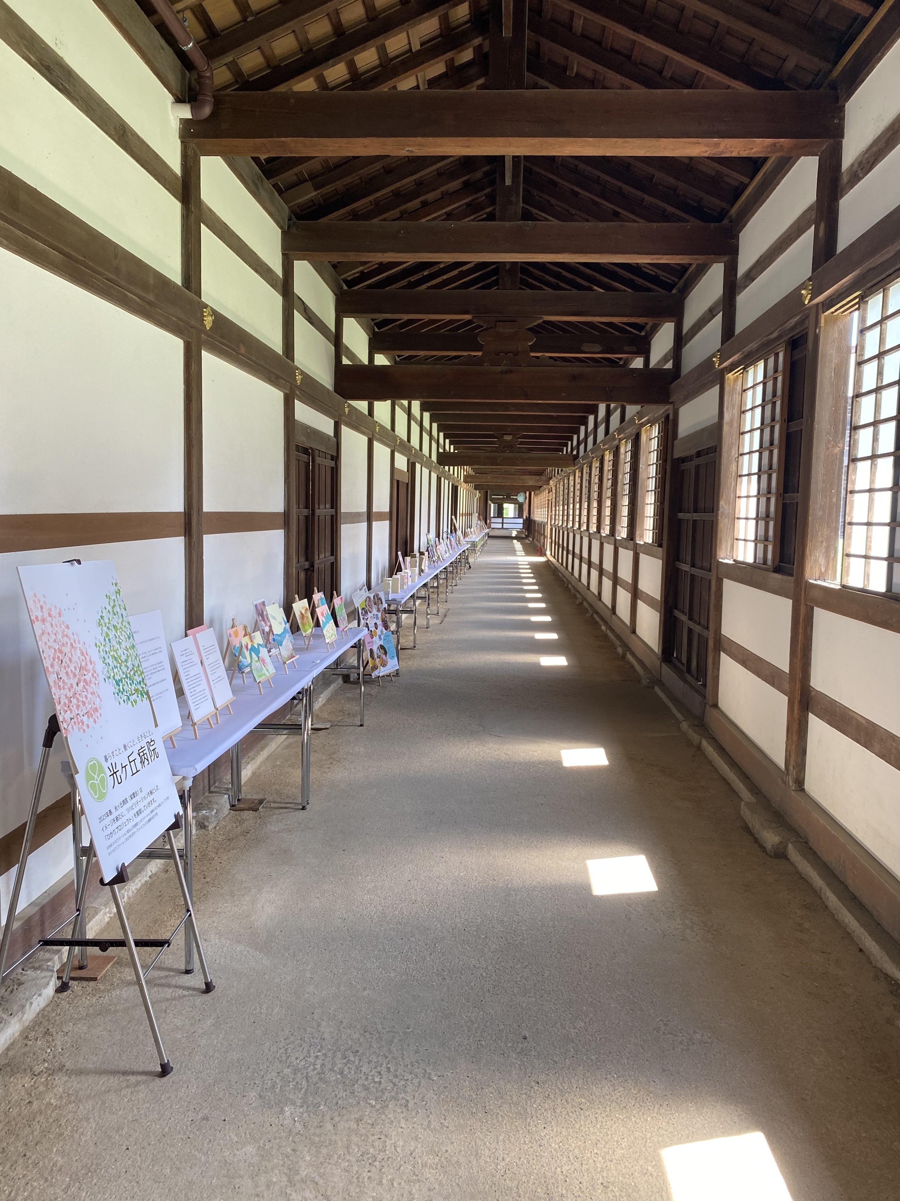 また瑞龍寺の長い回廊には、当法人で作成された患者さんやお子さんの臨床美術の作品がずらりと並びました。