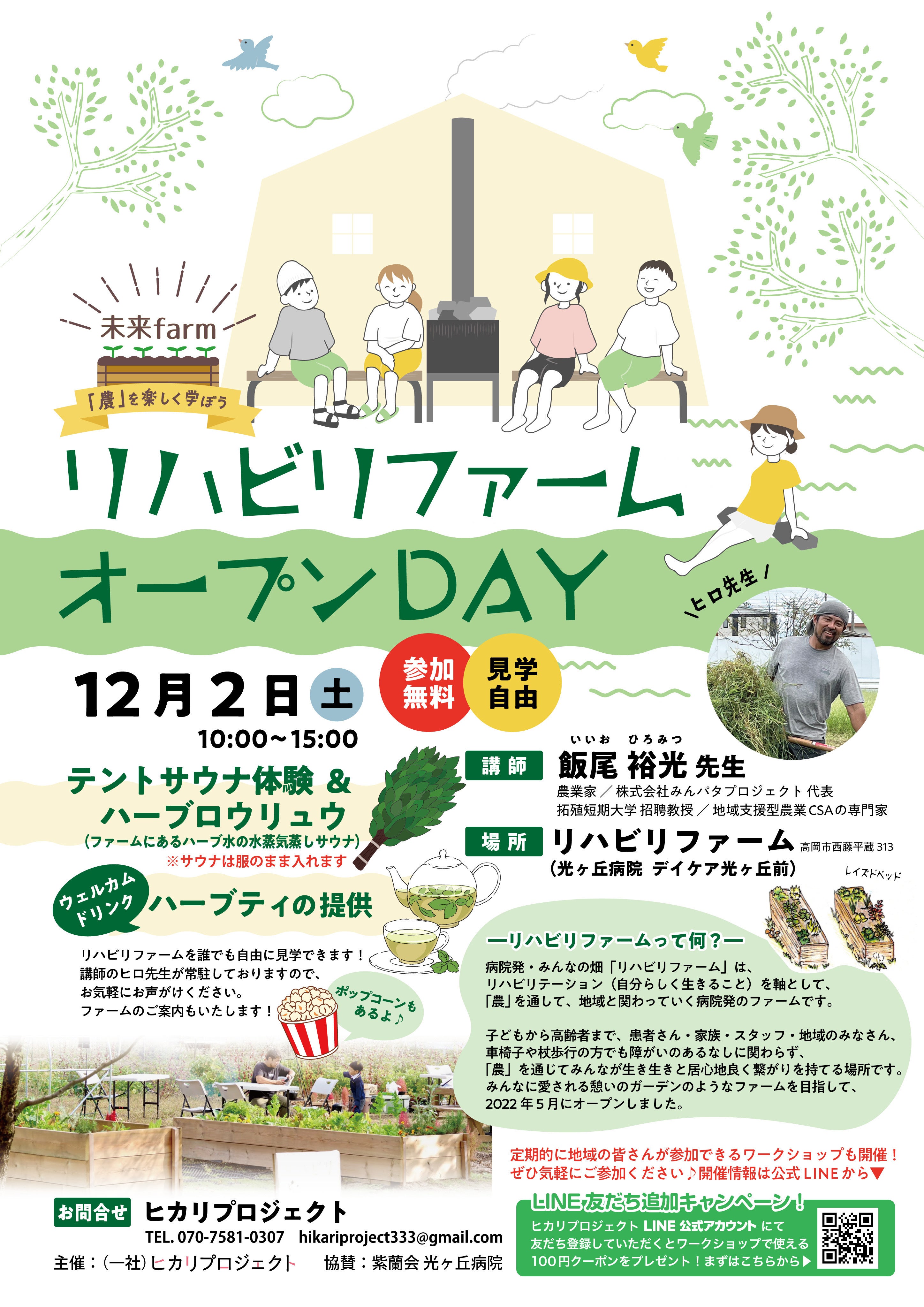 大好評であった「リハビリファーム・オープンDAY」の第二弾は、12月2日に開催予定です!誰でも参加OK。出入り自由。無料です。テントサウナ体験やハーブティやポップコーンの提供のあります。皆さんのお越しをお待ちしています。