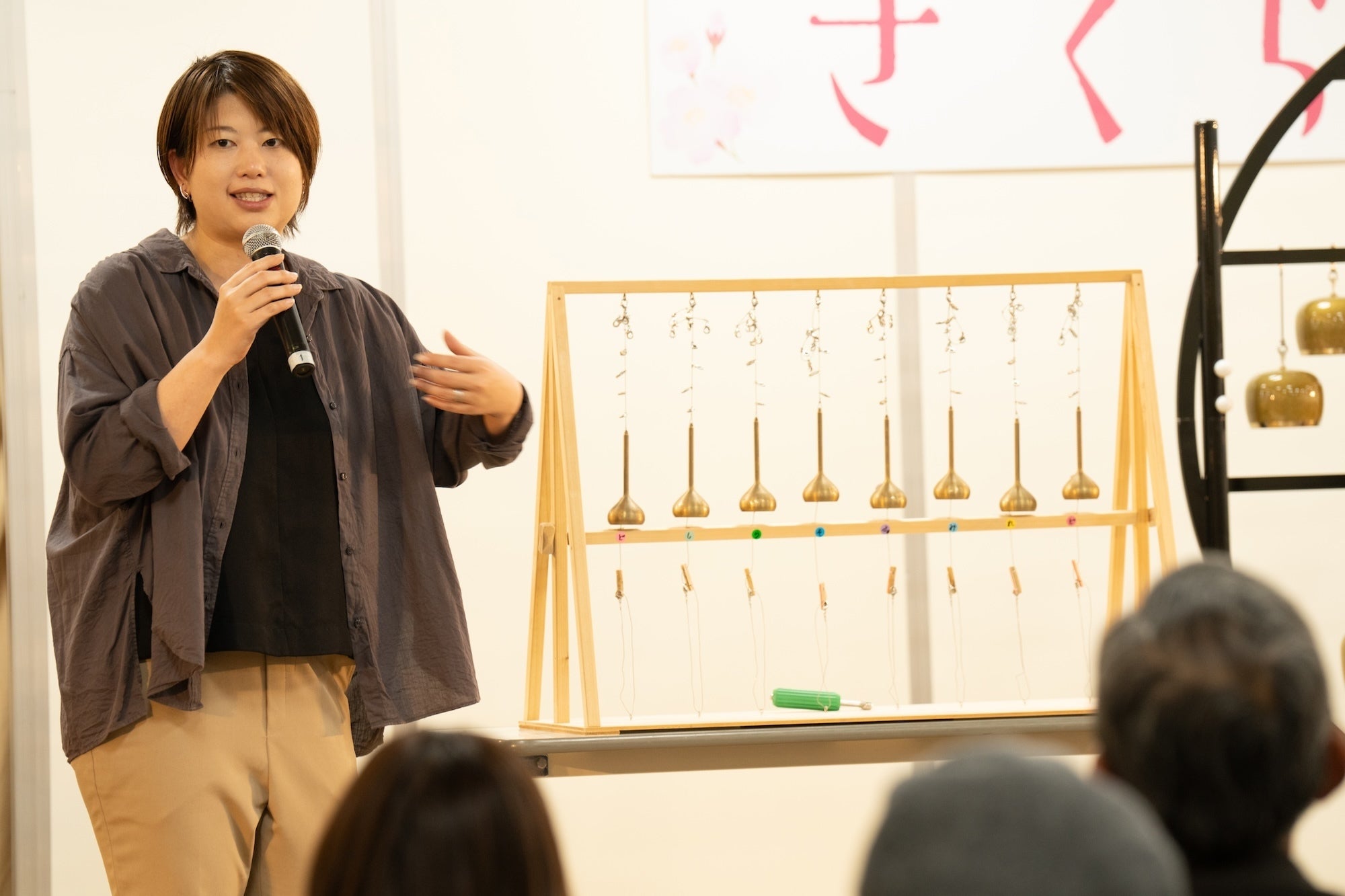 ※高岡銅器(左から):「能作の鐘」(株式会社 能作の「風鈴」の楽器)・「久乗編鐘」(株式会社 山口久乗) ・銅鑼(株式会社 宮津商店)・おりん(有限会社 シマタニ昇龍工房)