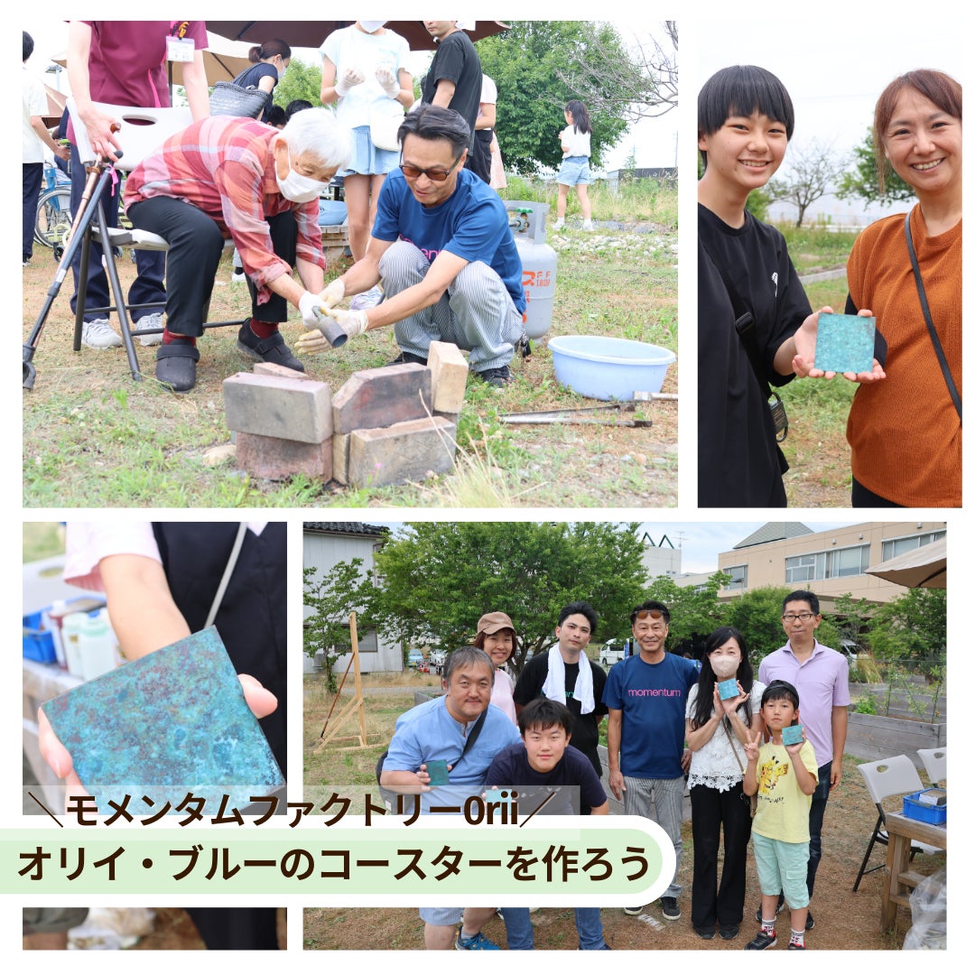 6月のオープンファームには、初のコラボ!モンメンタムファクトリーOriiさんより、折井社長とスタッフの皆さんがいらしていただき、オリイブルーのコースター作り・着色体験が行われました!