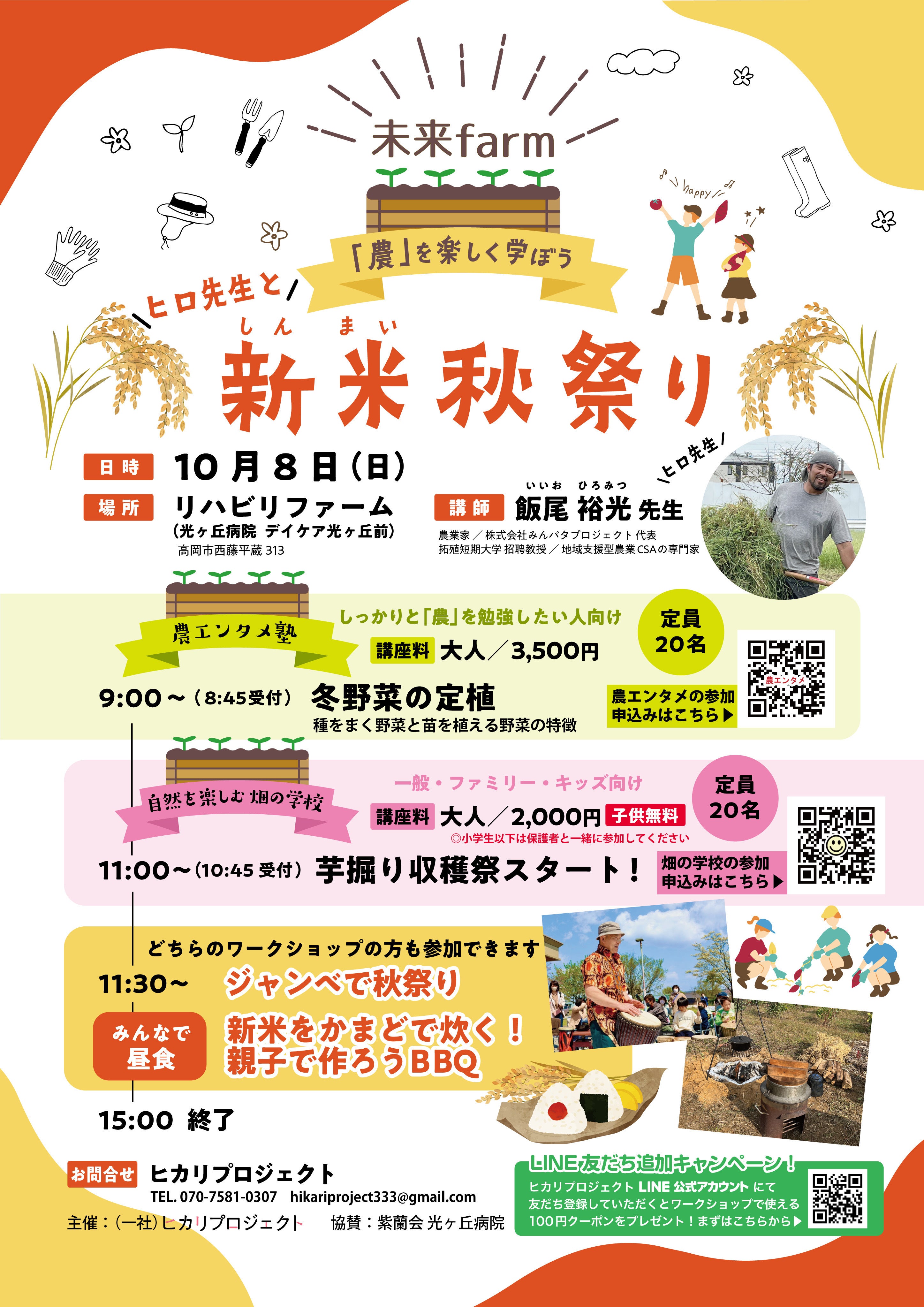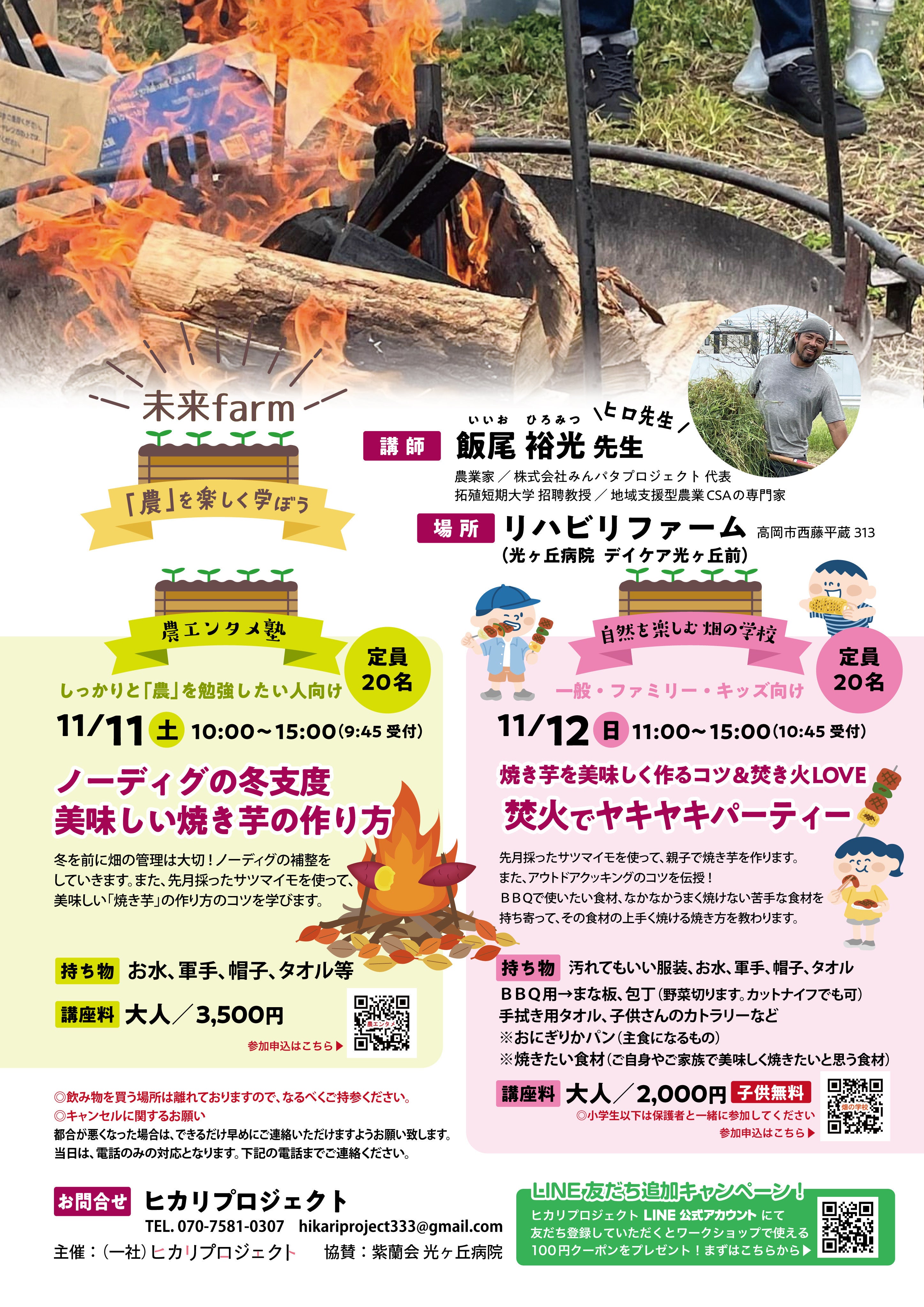今年最後のリハビリファームのワークショップの開催のお知らせです。皆様のご参加お待ちしております。11/11(土) 【農エンタメ塾】冬を前に畑の管理は大切です。ノ―ディグの補整をしていきます。また、先月採ったサツマイモを使って、美味しい「焼き芋」の作り方のコツを学びます。持ち物: お水、軍手、帽子、タオル等講座料: 大人/3,500円定員: 20名10:00〜15:00(9:45受付) お申し込みはこちらからhttps://docs.google.com/forms/d/1UfP2Bm5hV-RQ5GXRmqC-LeX5eYMgJE6HPVh1lWqDucQ/edit11/12(日) 【自然を楽しむ烟の学校】一般・ファミリー・キッズ向けテーマ 「焼き芋を美味しく作るコツ&焚き火love、焚火でヤキヤキパーティー」講座料: 大人/2,000円 子供無料定員: 20名 ※小学生以下は保護者と一緒に参加してください。11:00〜15:00(10:45受付) 先月採ったサツマイモを使って、親子で焼き芋を作ります。また、アウトドアクッキングのコツを伝授。BBQで使いたい食材、なかなかうまく焼けない苦手な食材を持ち寄って、その食材の上手く焼ける焼き方を教わります。持ち物: 汚れてもいい服装、お水、軍手、帽子、タオル ・BBQ用→まな板、包丁(野菜切ります。カットナイフでも可)、手拭き用タオル、子供さんのカトラリーなど ※おにぎりかパン(主食になるもの) ※焼きたい食材 (ご自身やご家族で美味しく焼きたいと思う食材) お申し込みはこちらからhttps://docs.google.com/forms/d/1IflSOHt2IJc2Af-unIDWDyJS3lDi1XeeUqoO-Rmm278/editお問合せ:ヒカリプロジェクト 担当 滝田TEL 070-7581-0307 メールアドレス hikariproject333@gmail.com主催:(一社)ヒカリプロジェクト 協賛:紫蘭会 光ヶ丘病院