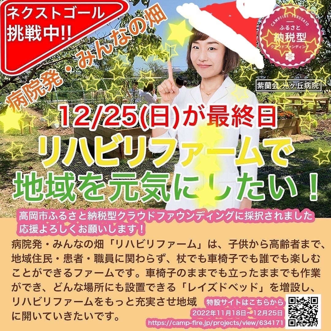リハビリファームの周りには、年に2回咲くさくらの木があり、今満開を迎えています。今週末のクラファン限定のワークショップでは、お花見をしながら、リハビリファームを満喫する時間になりますように。ご参加の皆様、ぜひ皆さんで楽しい時間を過ごしましょう。そして、今度の4月9日(日)には「光ヶ丘病院 さくら祭り」が行われます。その頃には、光ヶ丘病院の隣にある玄手川沿いのさくらが満開のはずです(予定、笑)さくら祭りでは、「リハビリファームの写真コンテスト」の表彰式も行います。光ヶ丘病院から、新しいロゴマーク・タグライン・改修などについての発表や参加型のワークショップとして、みんなで輪になって、音とアートを使って、一体感を感じるワーク「さくらサークル」、ドラム・サークル体験、臨床美術体験もあり盛りだくさんです。(臨床美術は、申し込み受付中です!)また、高岡や富山の人気店の出店もあります。新生リハビリファームも見に、是非いらしてください。出店の詳細や、プログラムなどは、随時インスタグラムやFBで発信していきますので、ぜひチェックしてみてください。https://www.instagram.com/hikarigaoka_hospital/