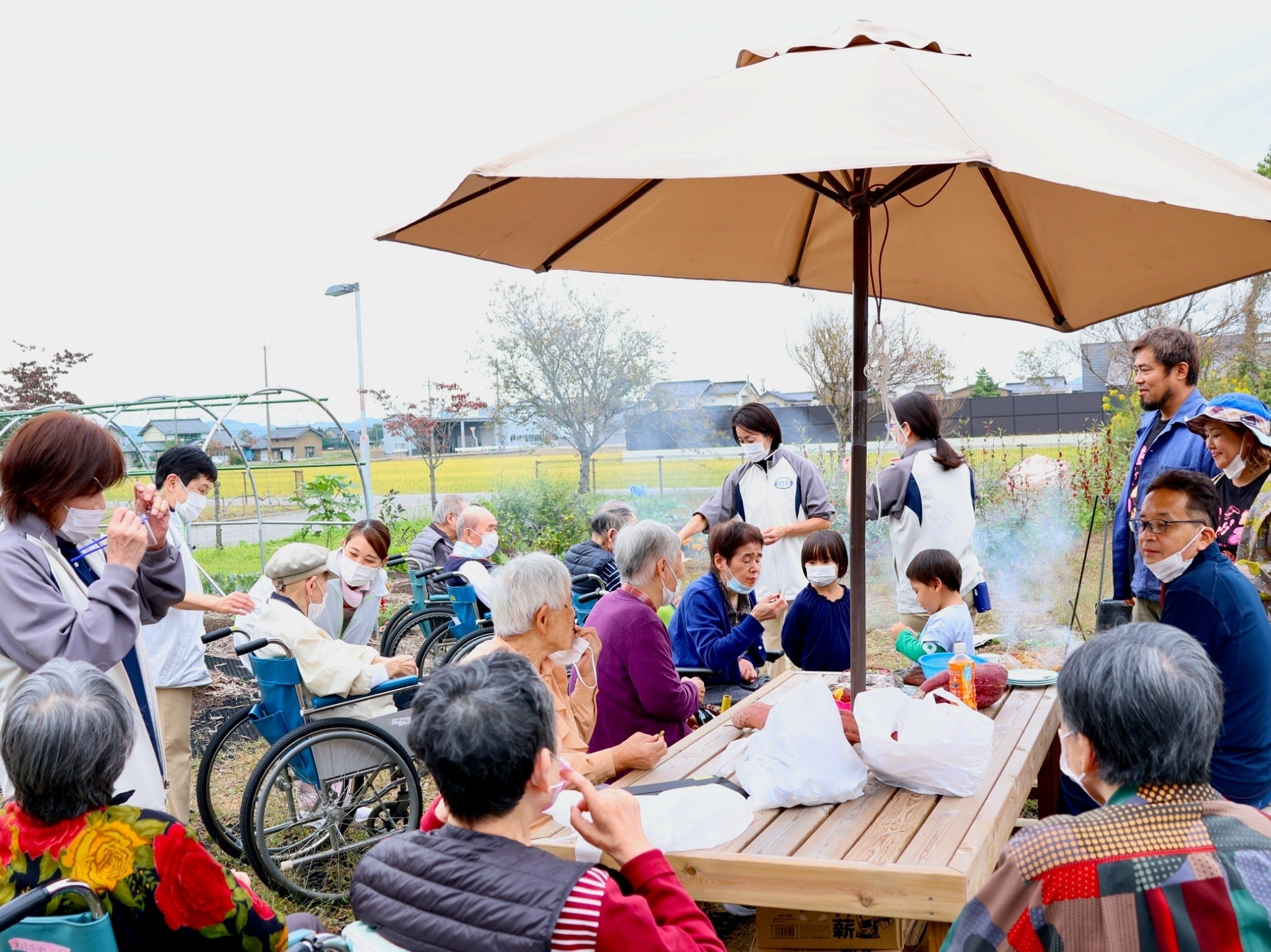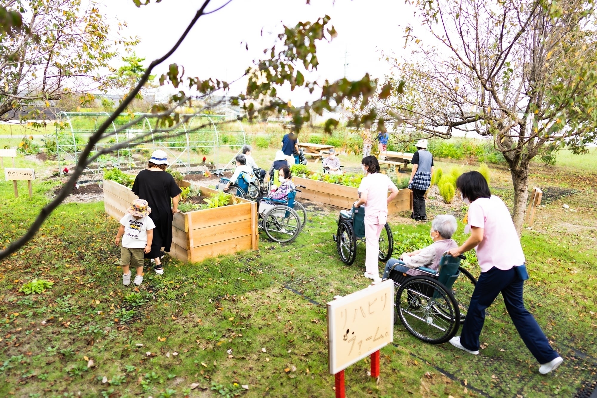 リハビリファームができ、今では、子供から高齢者まで様々な世代の様々な身体状態の方(車椅子でも杖でも)が、野菜定植から収穫、お散歩、休憩タイムなど、さまざまな過ごし方で楽しみ、意欲の向上や生きがいを感じるような癒しの時間になっています。